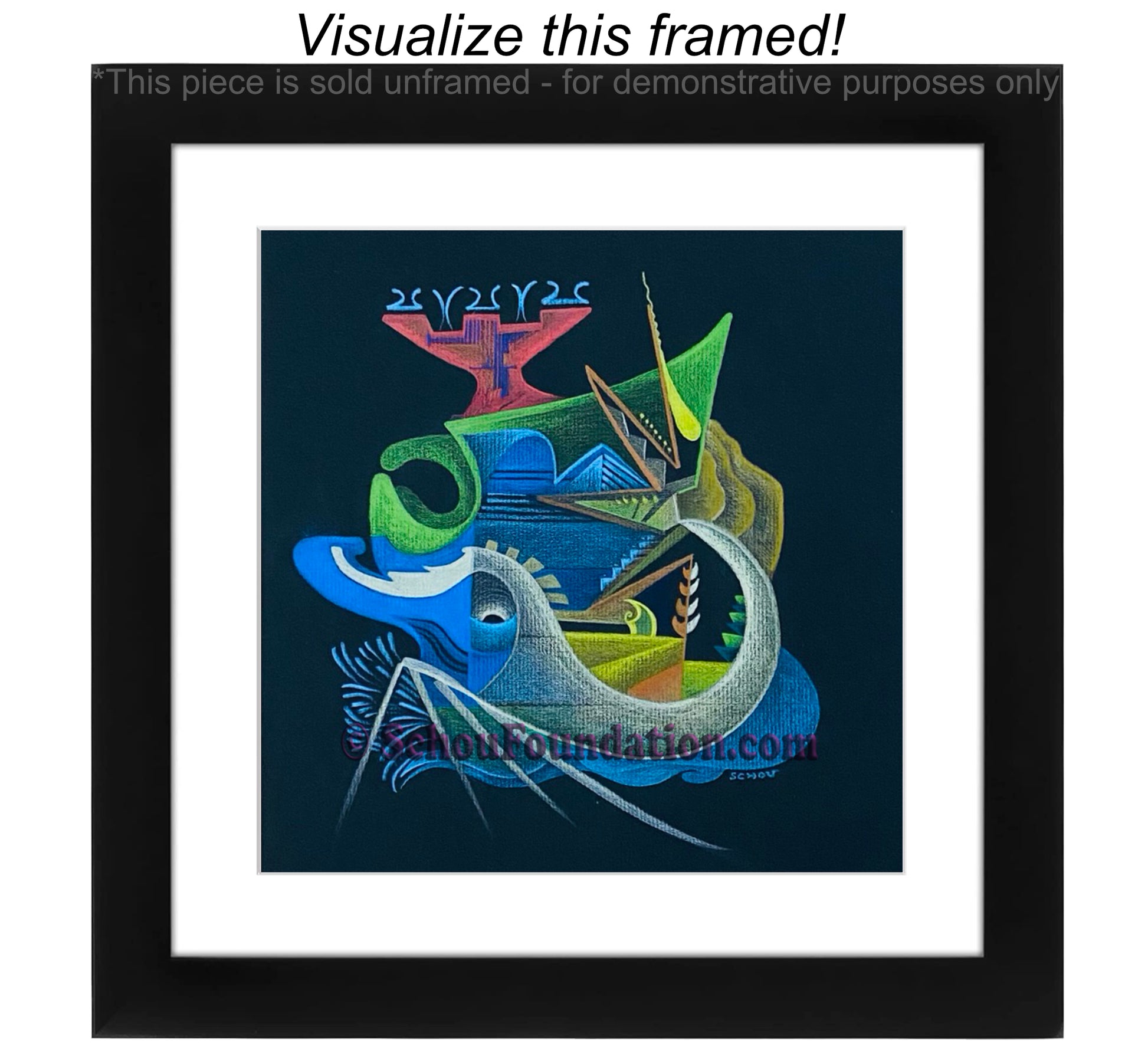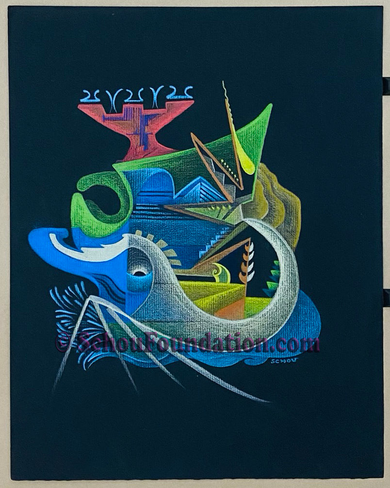 This elegant, complicated original features Prismacolor wax pencil on heavy-tooth black paper, part of the Black Paper Series. Created by San Francisco artist John Schou, this artwork is signed and dated 11/1966.