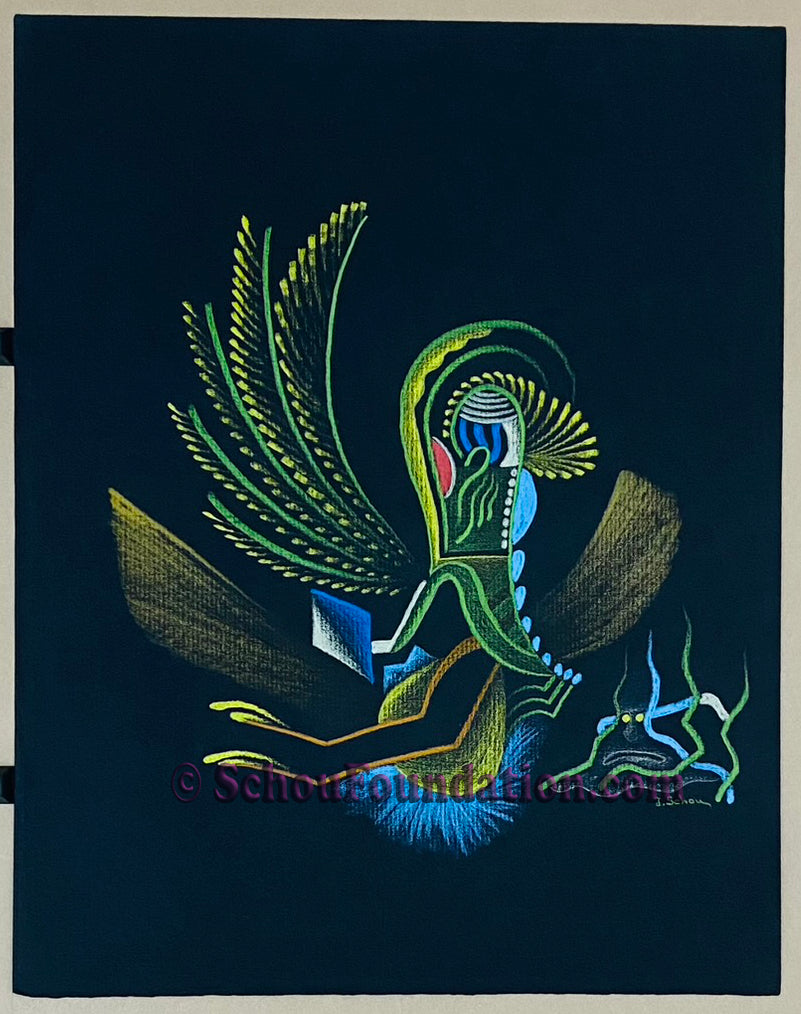 This elegant, complicated original features Prismacolor wax pencil on heavy-tooth black paper, part of the Black Paper Series. Created by San Francisco artist John Schou, this artwork is signed and dated 11/1966.