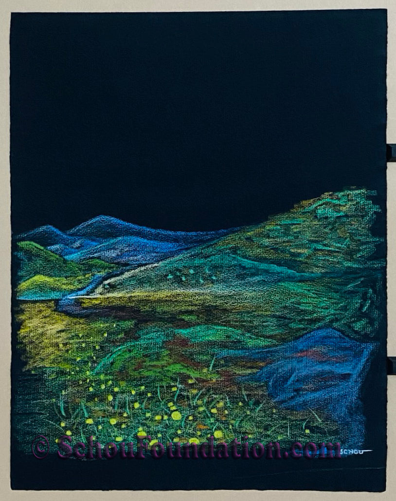 This beautiful original features Prismacolor wax pencil on heavy-tooth black paper, part of the Black Paper Series. Created by San Francisco artist John Schou, this artwork is signed and dated 3/1967.