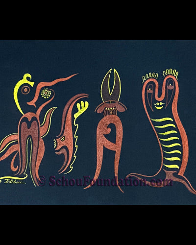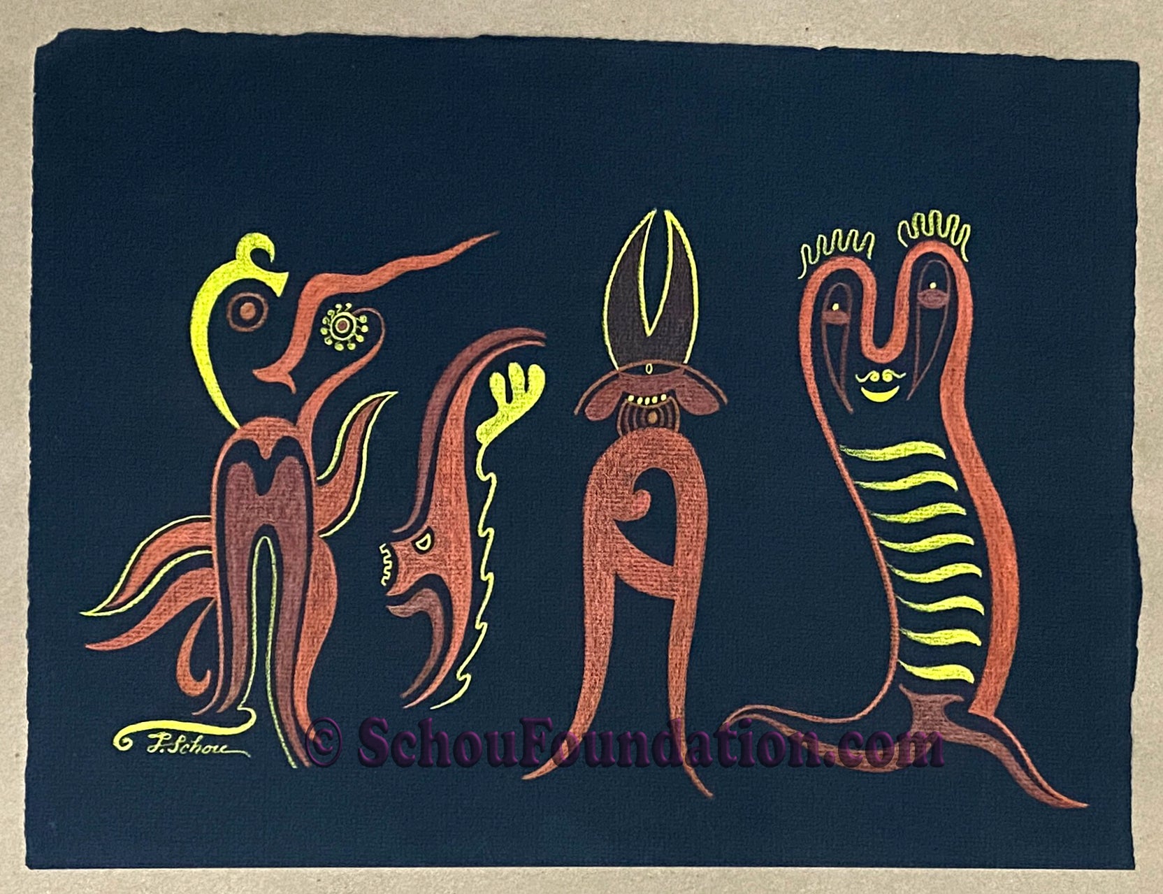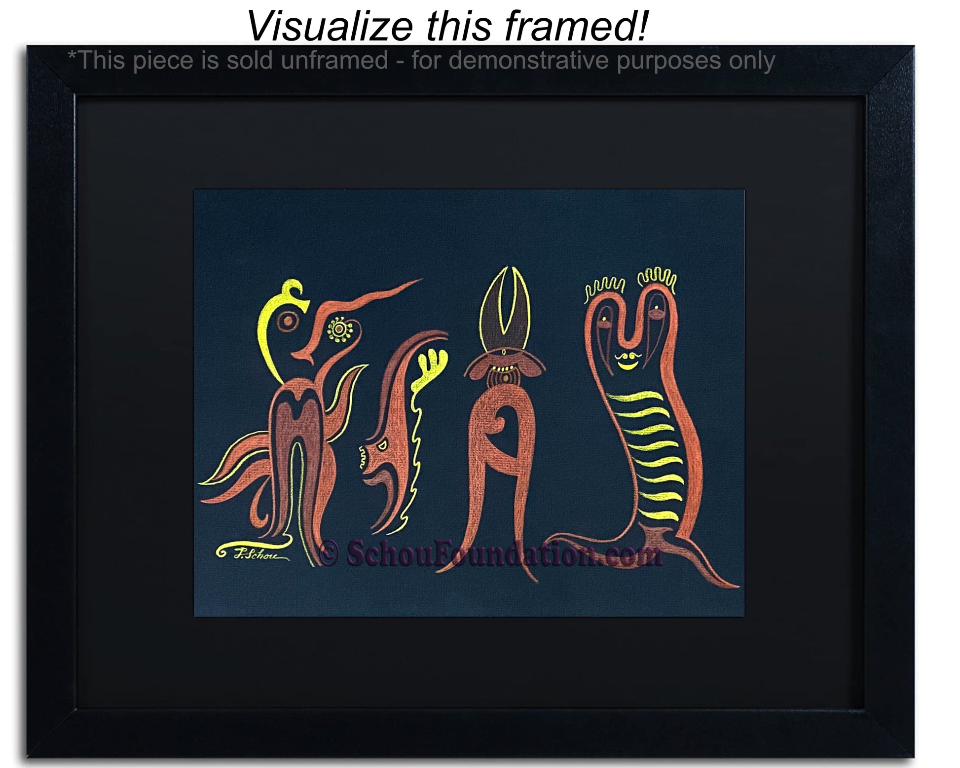 "The Family" is a complex vignette designed with Prismacolor wax pencil on heavy-toothed black paper; part of the Black Paper Series by San Francisco artist John Schou. Piece is signed and undated, circa 1967-1971.