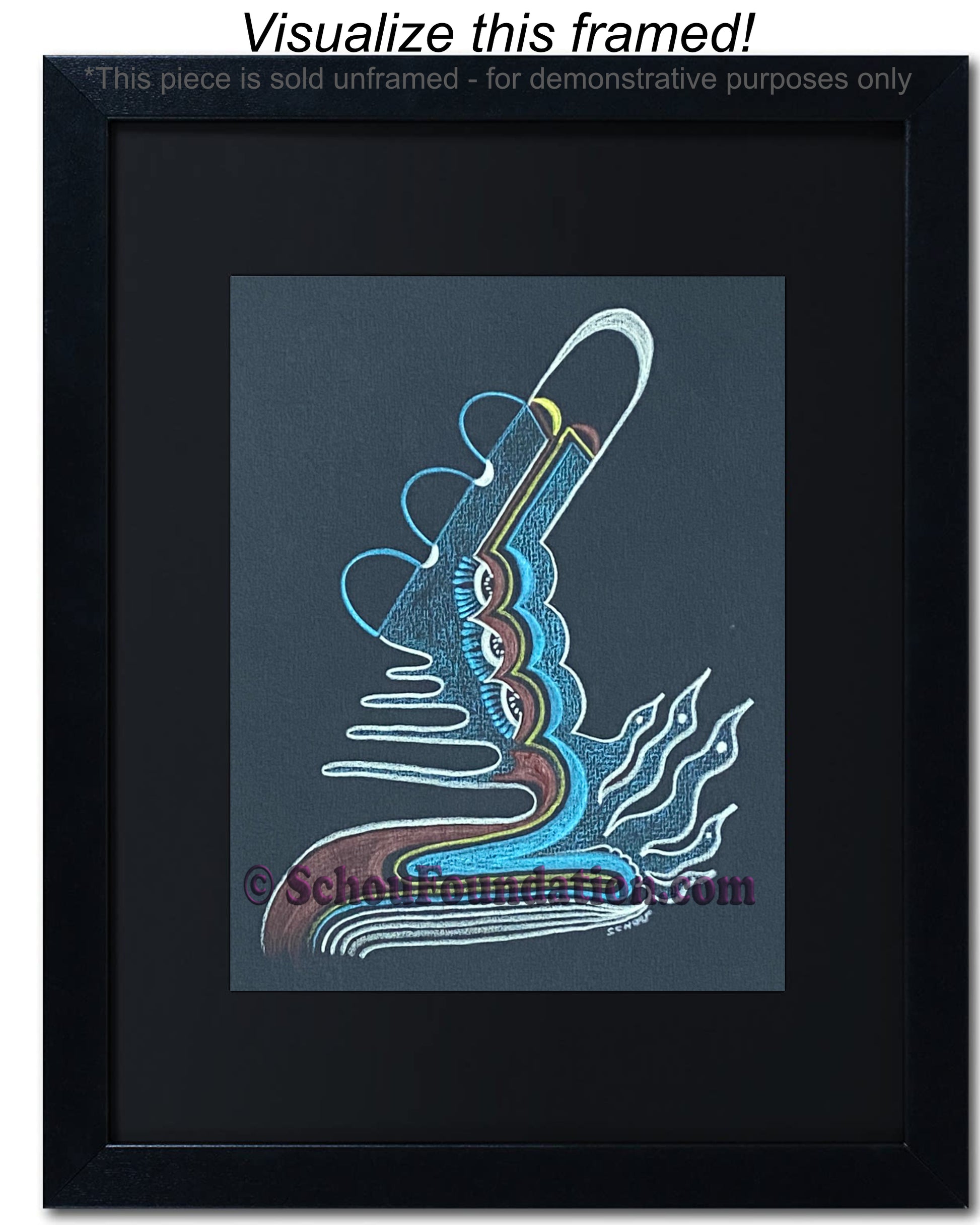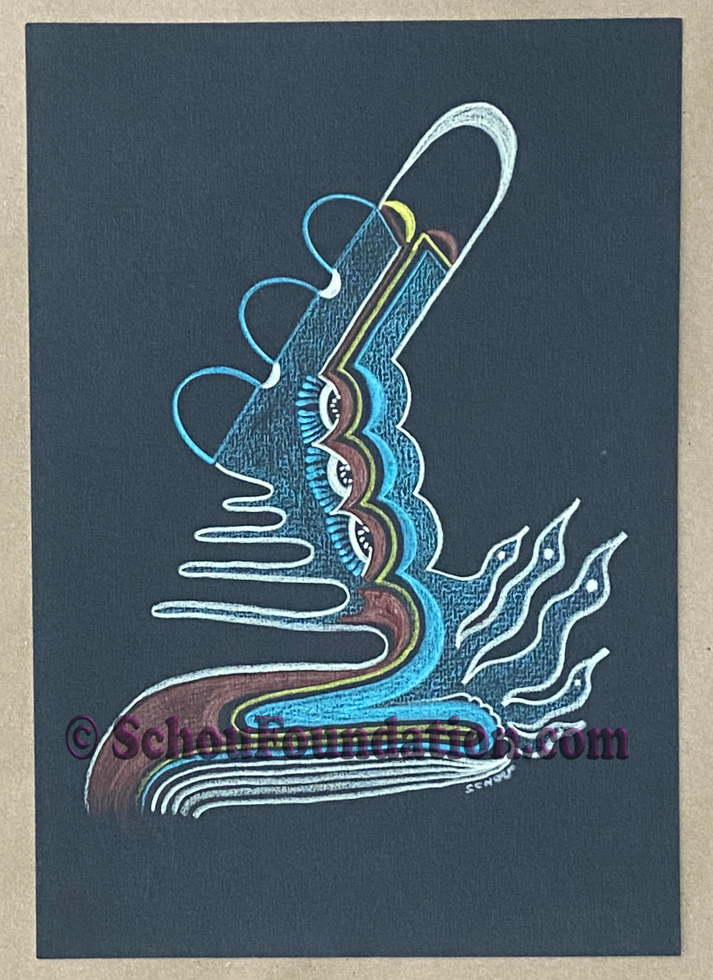 "Under the Microscope" is a moderately complex vignette designed with Prismacolor wax pencil on heavy-toothed black paper; part of the Black Paper Series by San Francisco artist John Schou. Piece is signed and undated, circa 1967-1971.