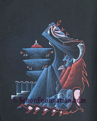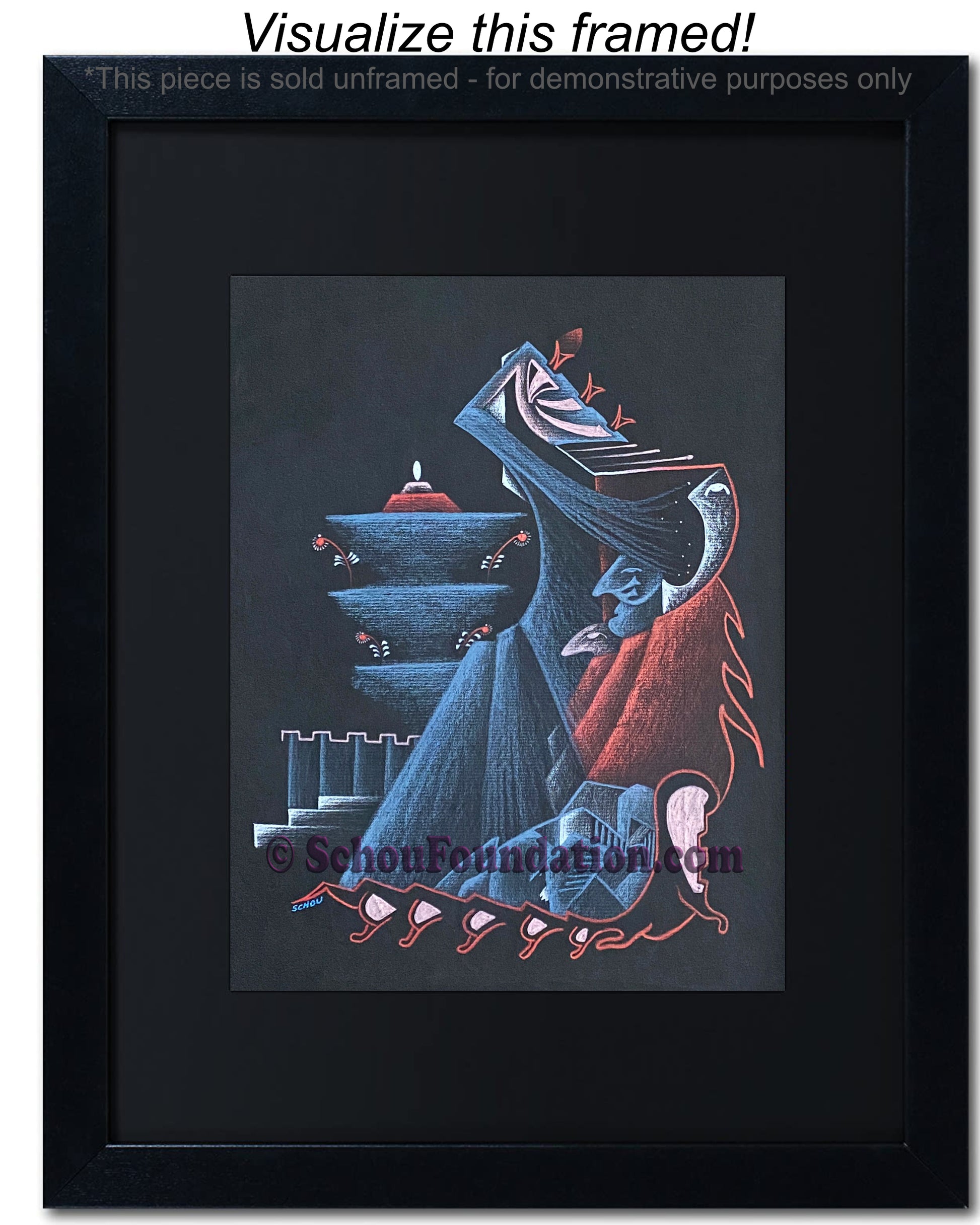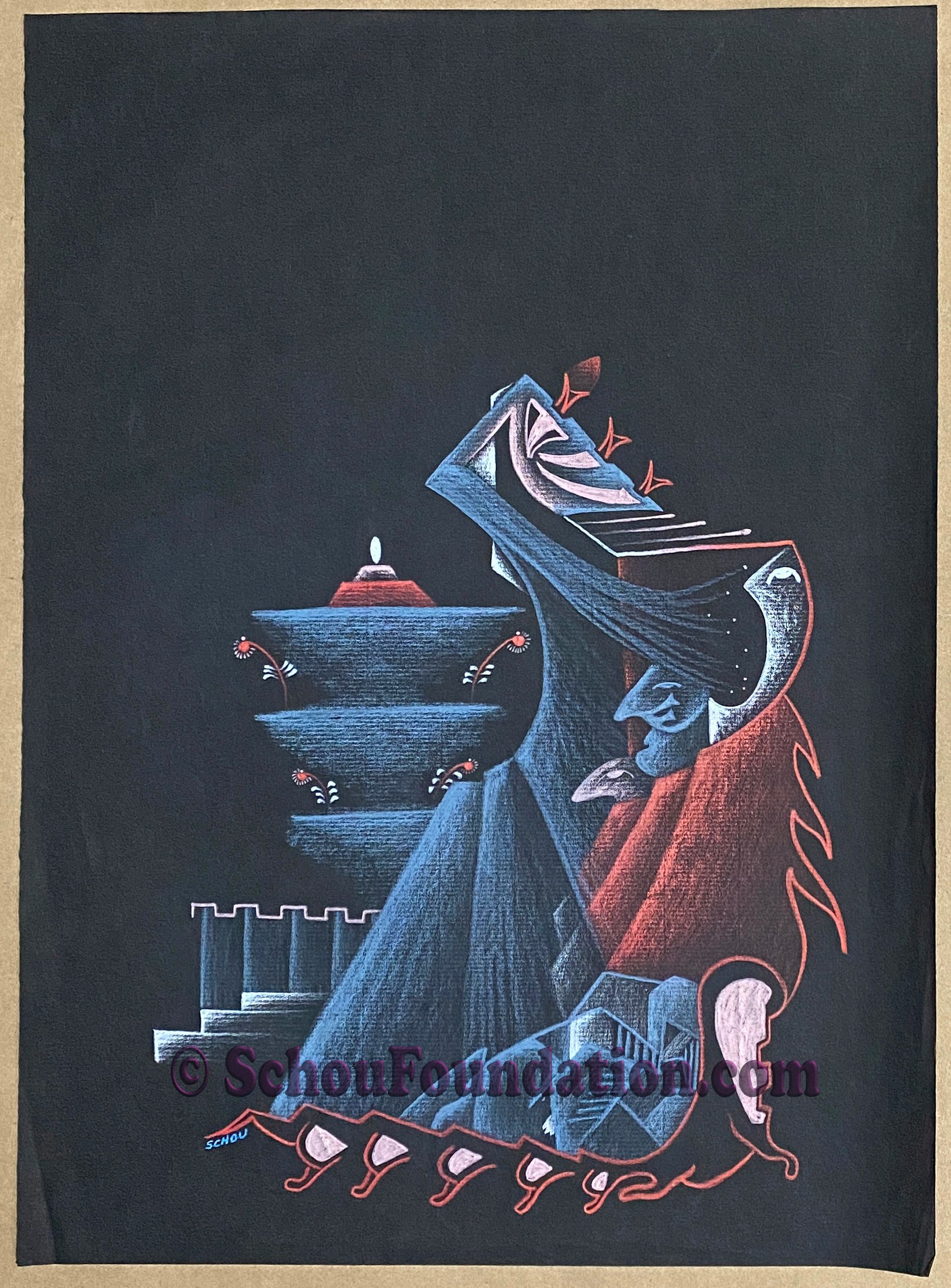 Complex vignette was created with Prismacolor wax pencil on heavy-toothed black paper; part of the Black Paper Series by San Francisco artist John Schou. Piece is signed and undated, circa 1966-1971.
