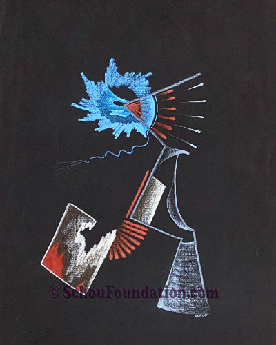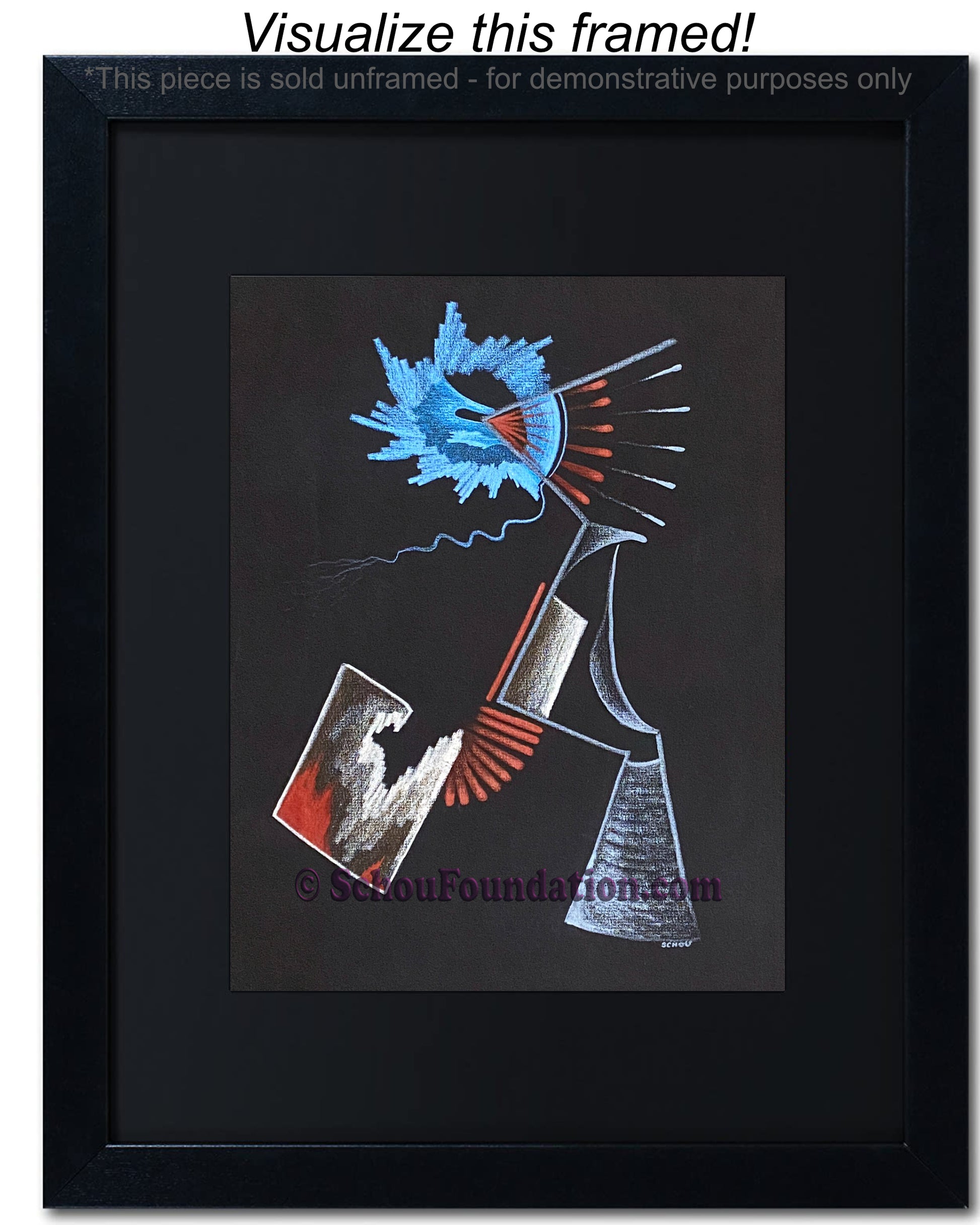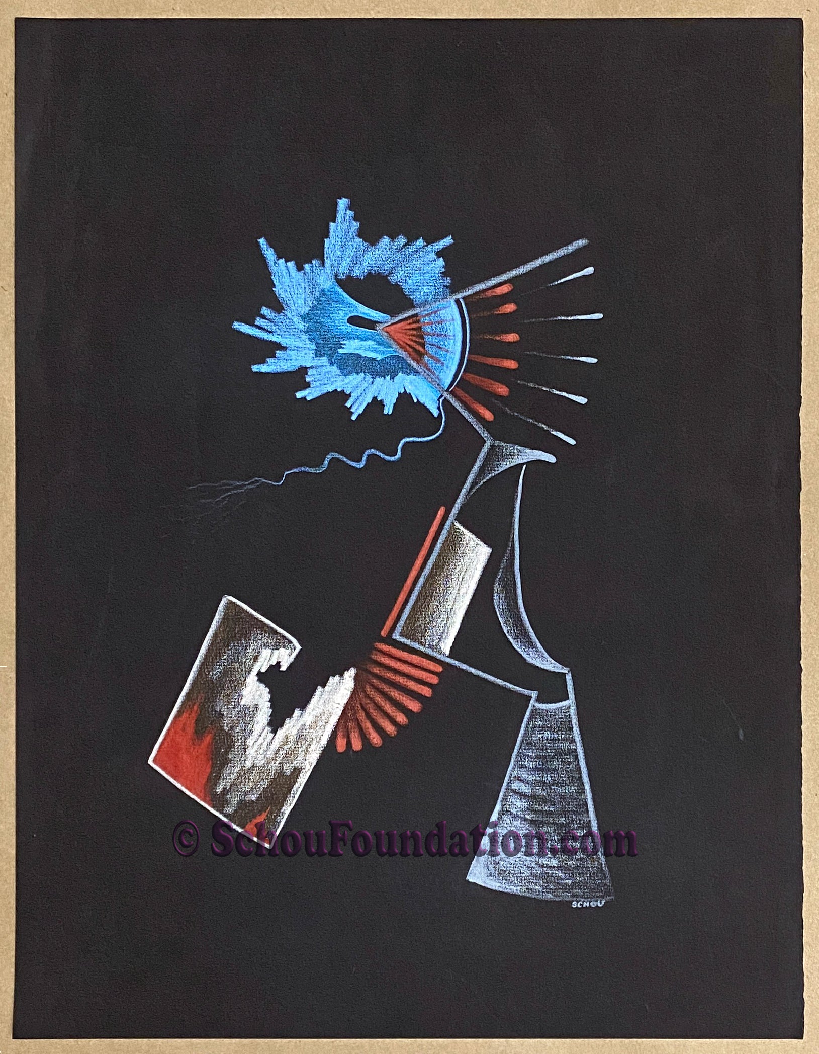 Simple and elegant vignette created with Prismacolor wax pencil on heavy-toothed black paper; part of the Black Paper Series by San Francisco artist John Schou. Piece is signed and undated, circa 1967-1971.
