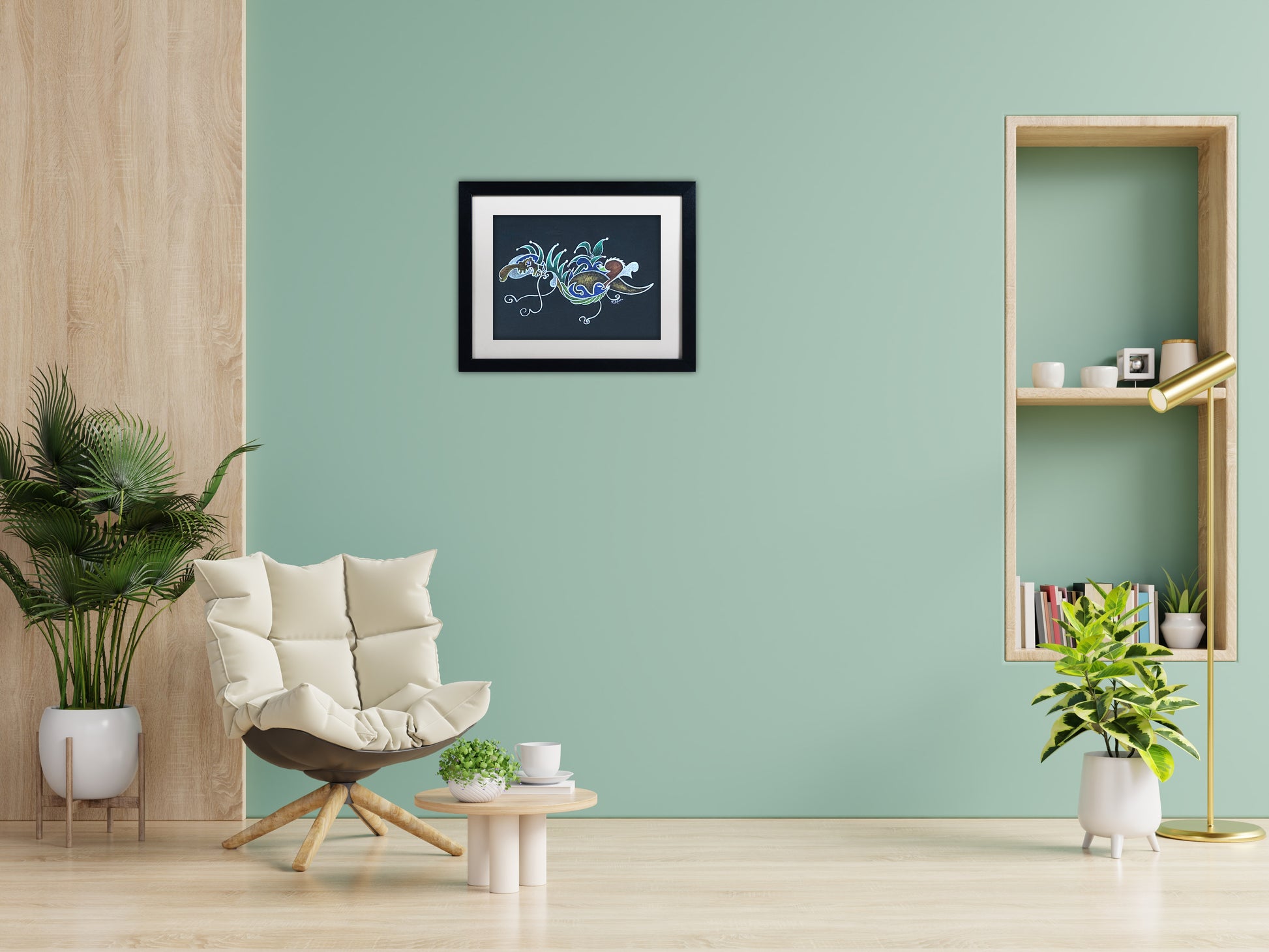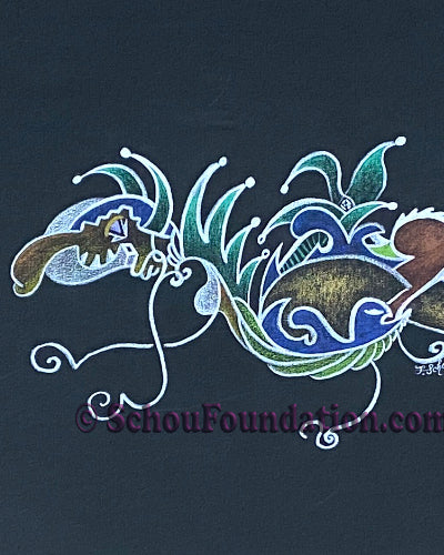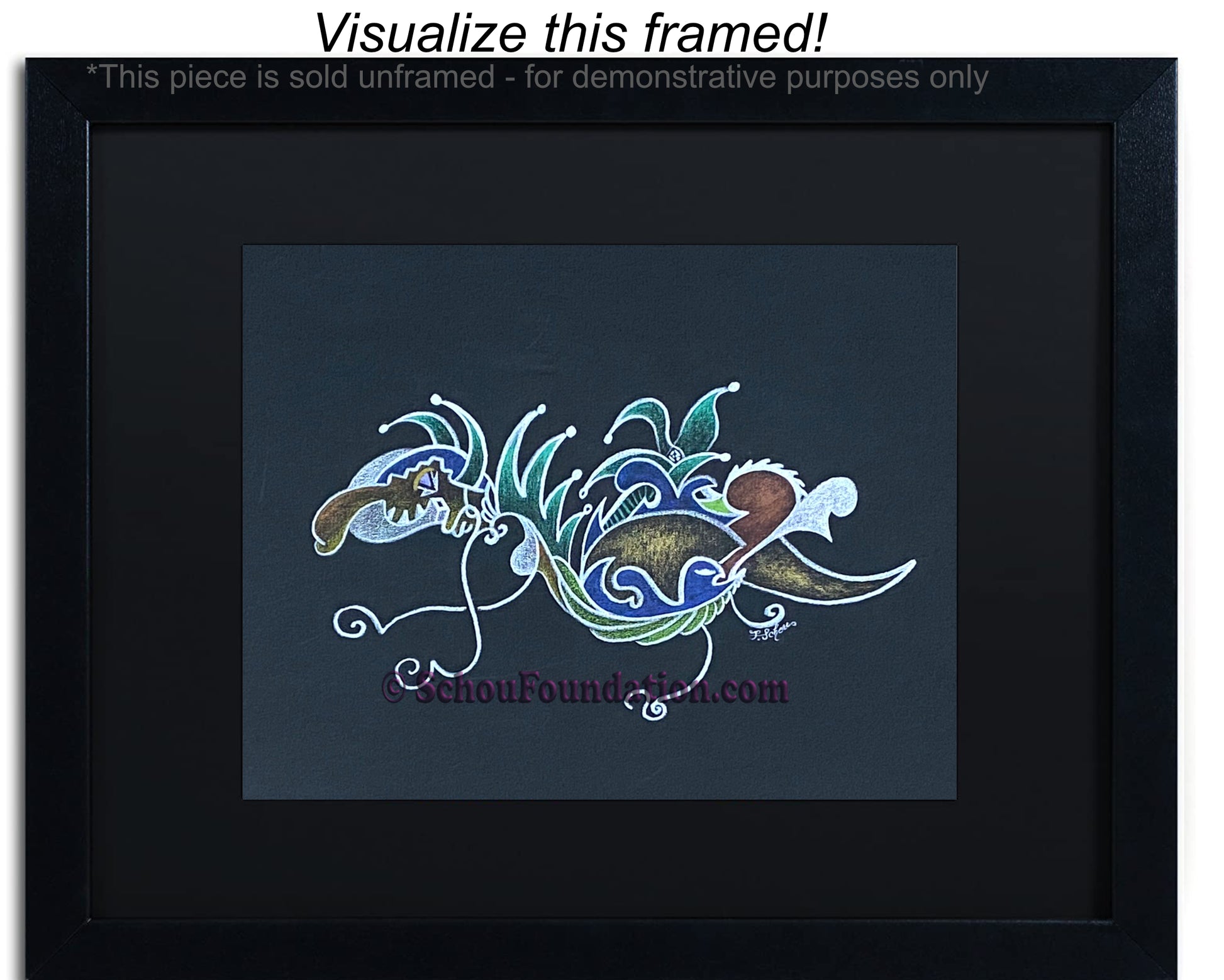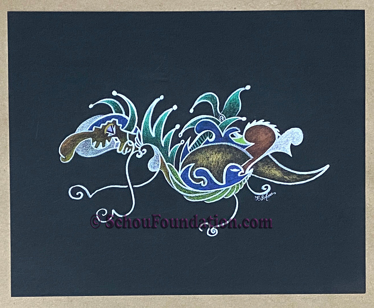 Complex vignette was created with Prismacolor wax pencil on heavy-toothed black paper; part of the Black Paper Series by San Francisco artist John Schou. Piece is signed and undated, circa 1967-1971.