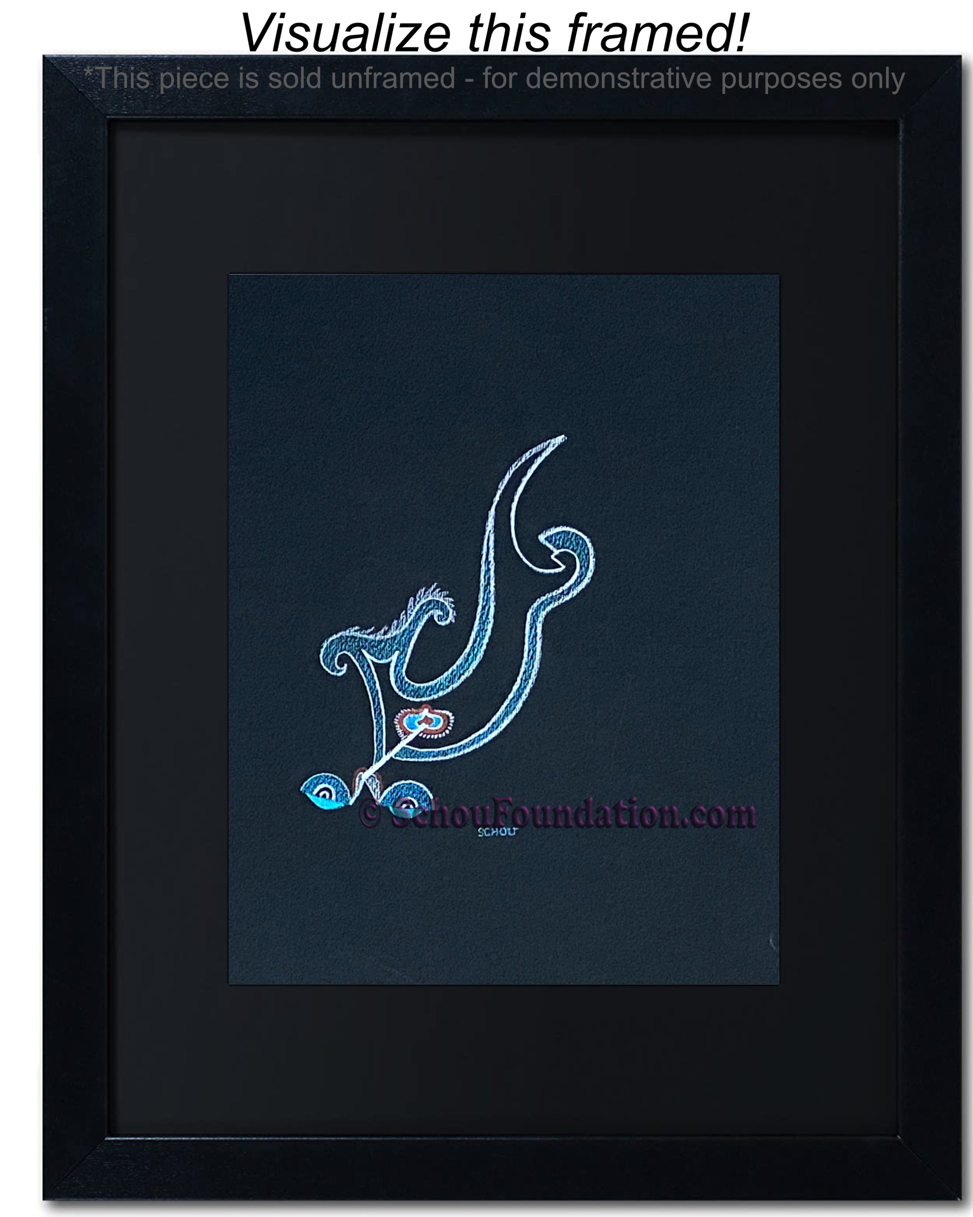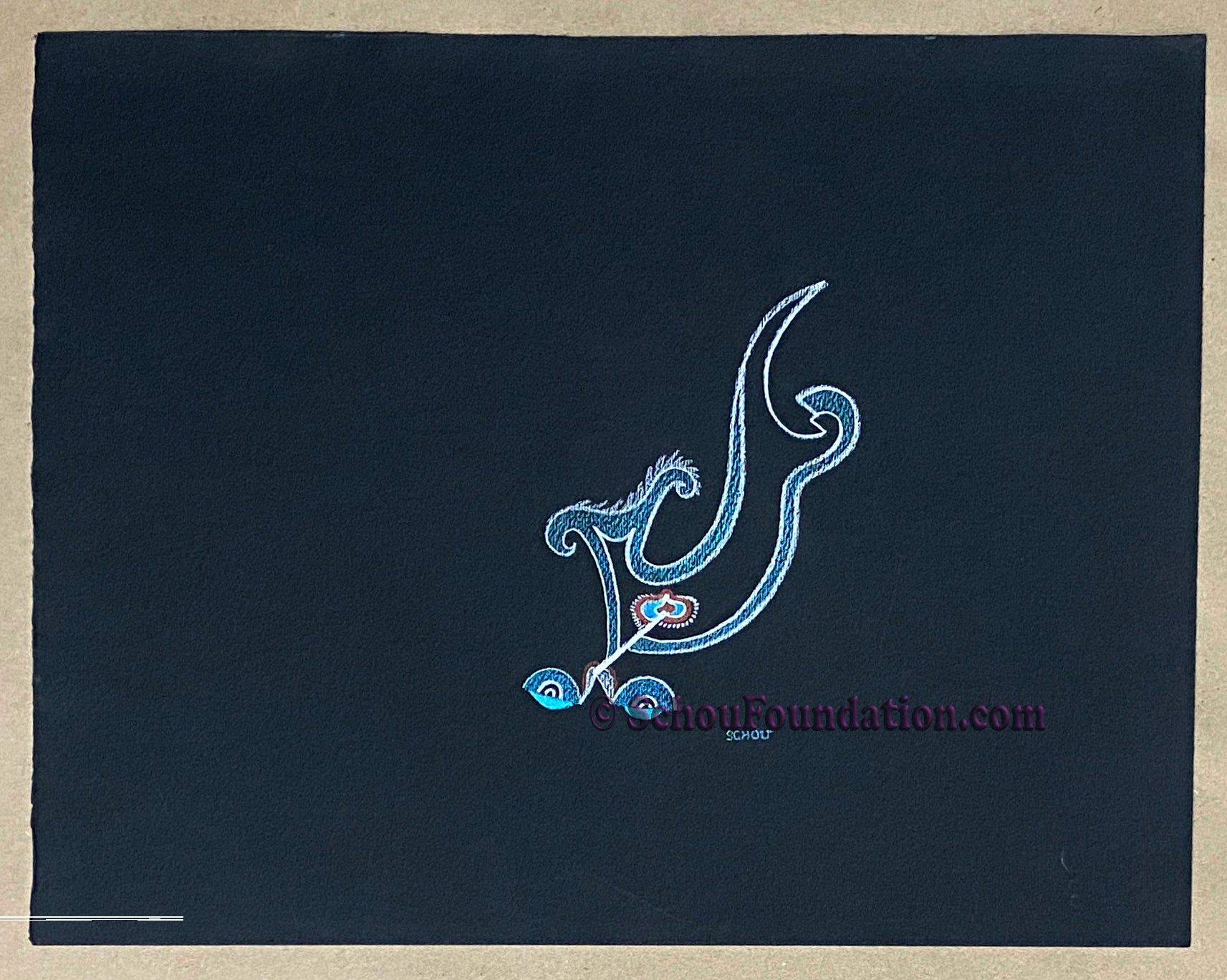 Simple and elegant vignette created with Prismacolor wax pencil on heavy-toothed black paper; part of the Black Paper Series by San Francisco artist John Schou. Piece is signed and undated, circa 1967-1971.