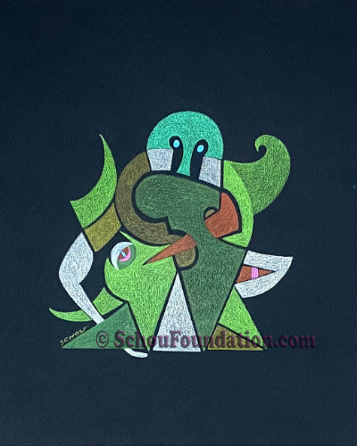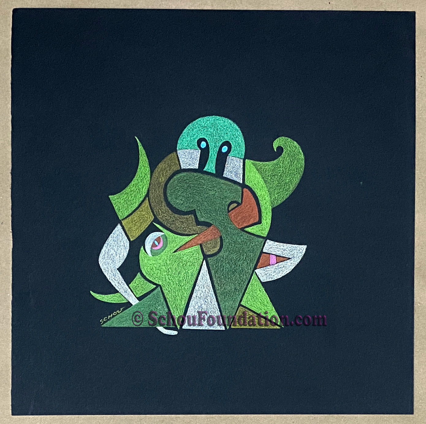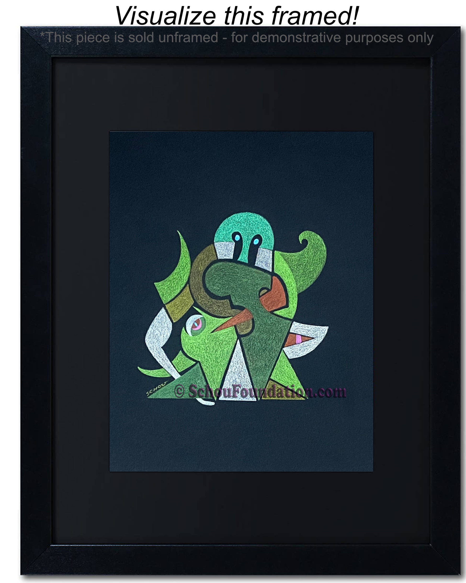 Complex vignette was created with Prismacolor wax pencil on heavy-toothed black paper; part of the Black Paper Series by San Francisco artist John Schou. Piece is signed and undated, circa 1967-1971.