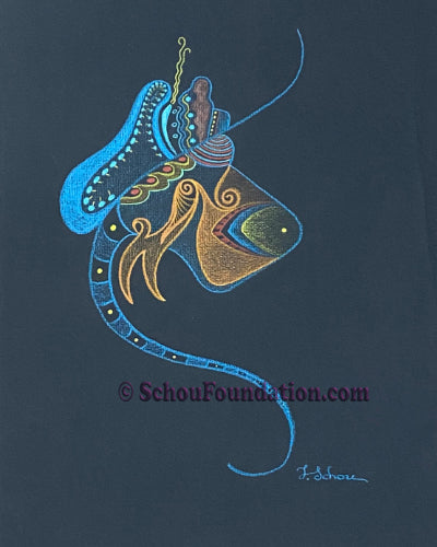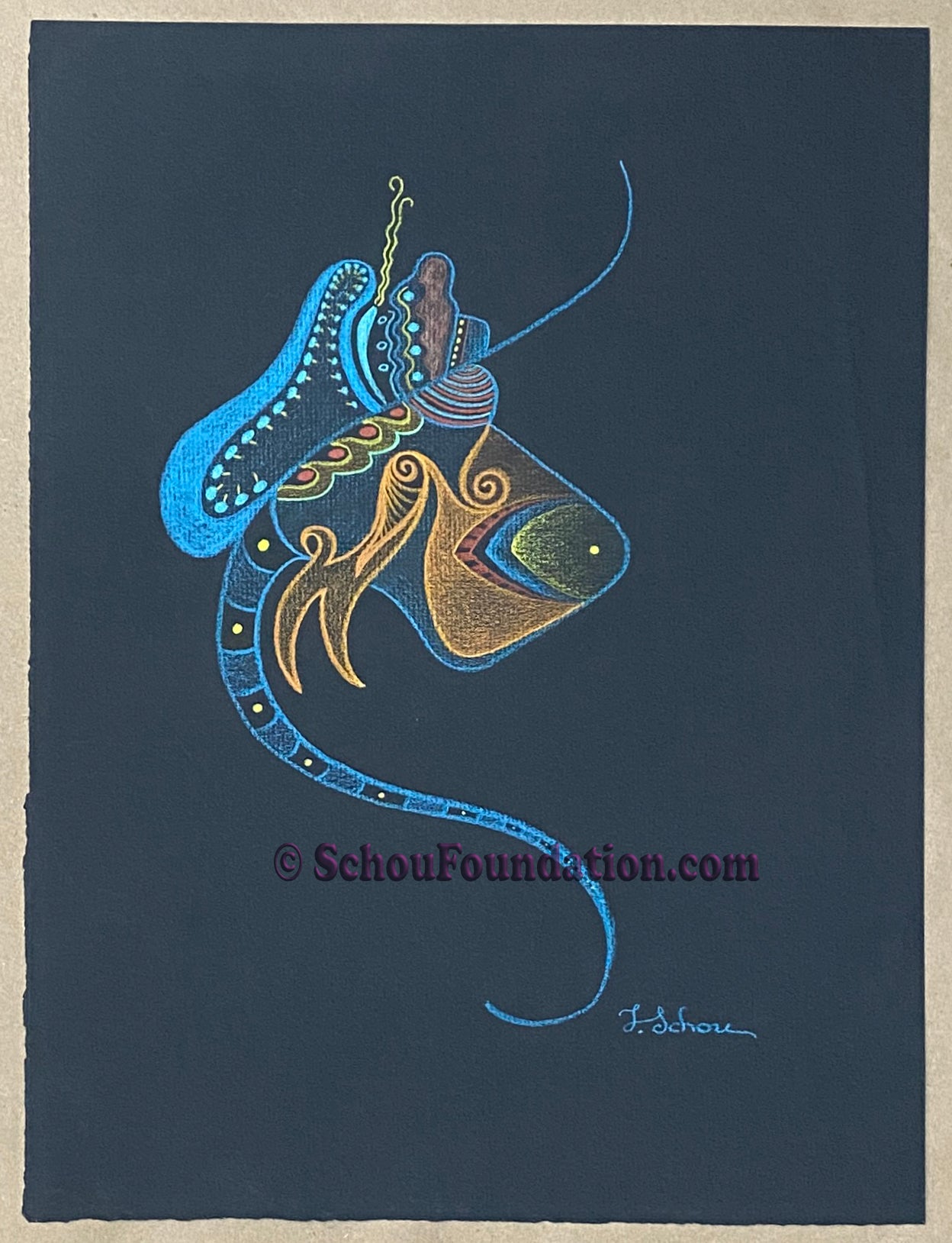 Moderately complex vignette was created with Prismacolor wax pencil on heavy-toothed black paper; part of the Black Paper Series by San Francisco artist John Schou. Piece is signed and undated, circa 1967-1971.