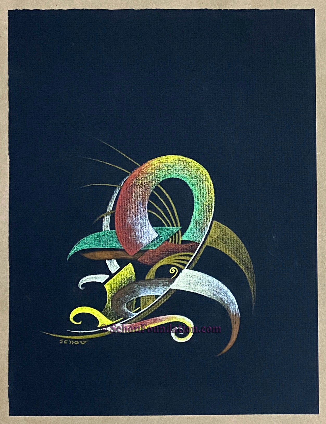 Complex vignette was created with Prismacolor wax pencil on heavy-toothed black paper; part of the Black Paper Series by San Francisco artist John Schou. Piece is signed and undated, circa 1967-1971.