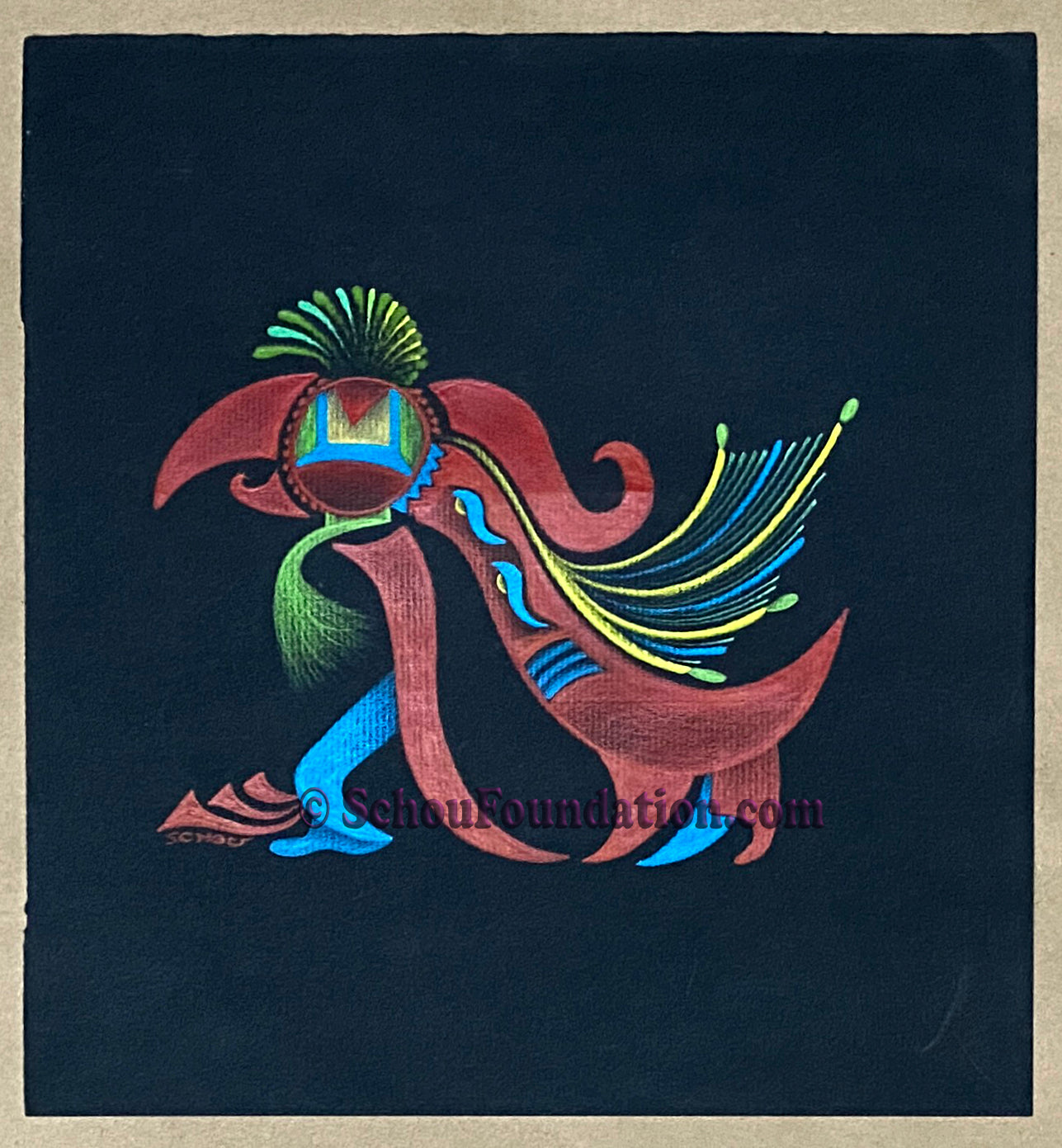 Complex vignette was created with Prismacolor wax pencil on heavy-toothed black paper; part of the Black Paper Series by San Francisco artist John Schou. Piece is signed and undated, circa 1967-1971.