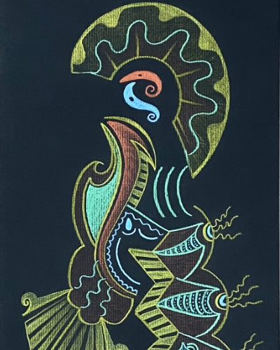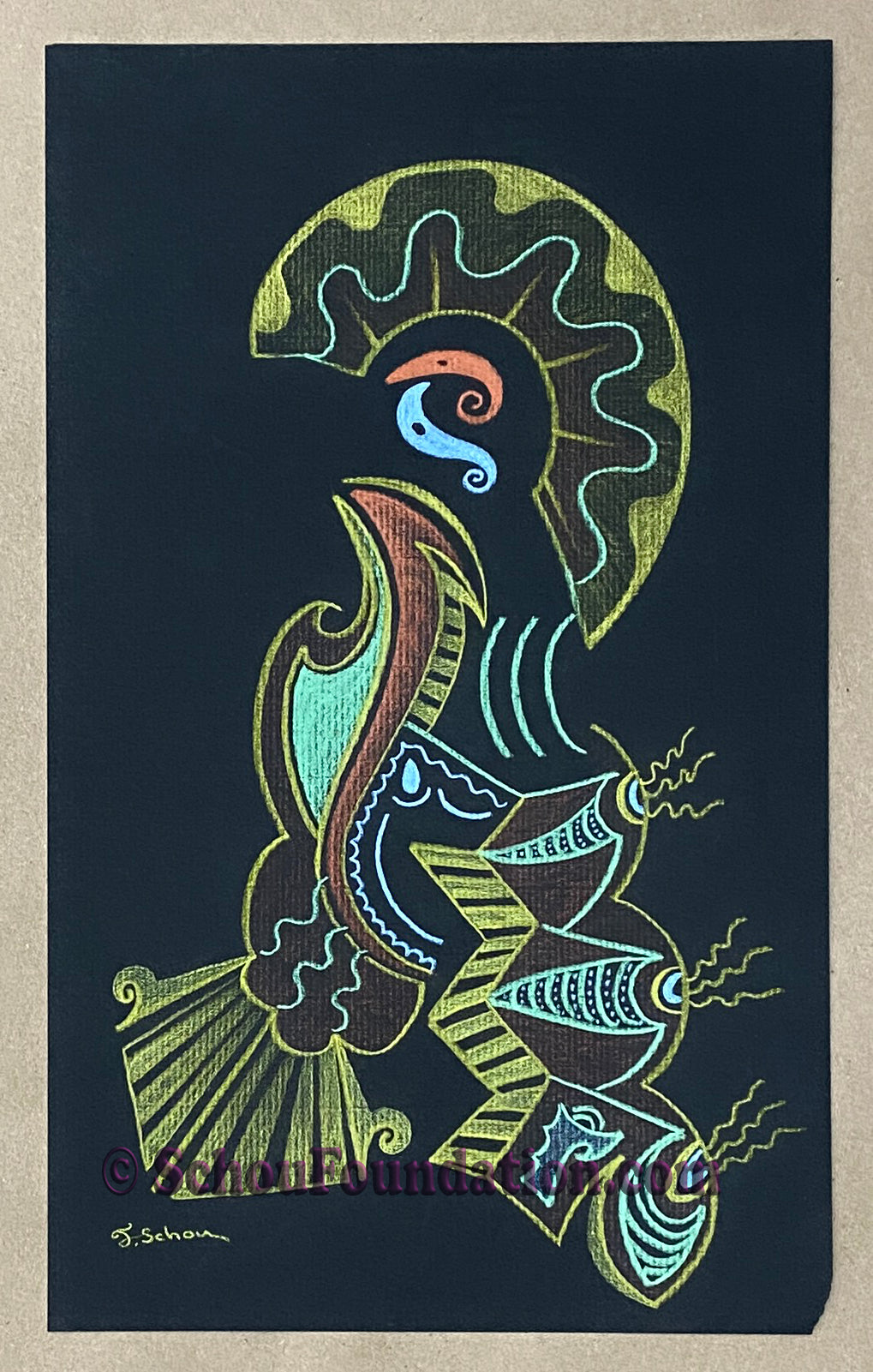 Moderately complex vignette was created with Prismacolor wax pencil on heavy-toothed black paper; part of the Black Paper Series by San Francisco artist John Schou. Piece is signed and undated, circa 1967-1971.