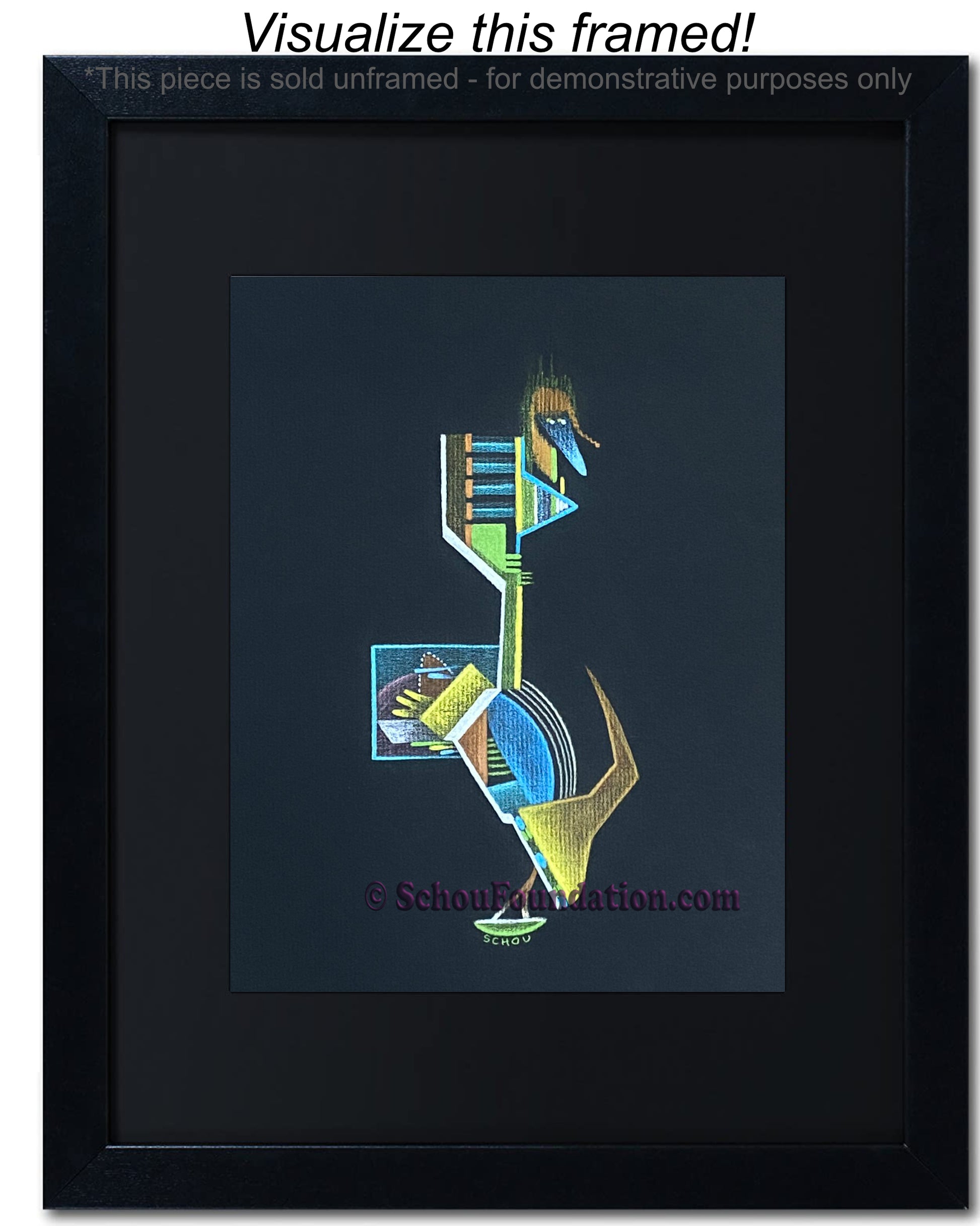 Complex vignette was created with Prismacolor wax pencil on heavy-toothed black paper; part of the Black Paper Series by San Francisco artist John Schou. Piece is signed, he started it in 1966.