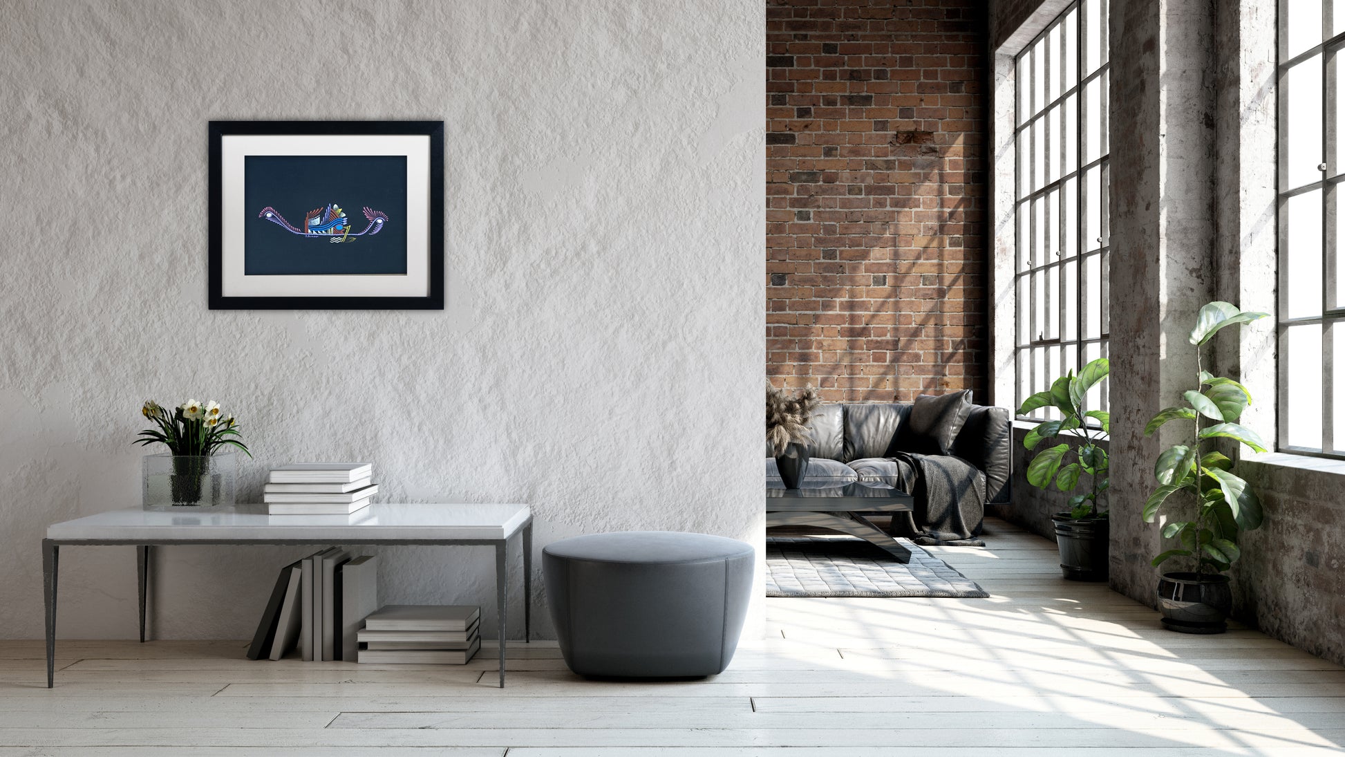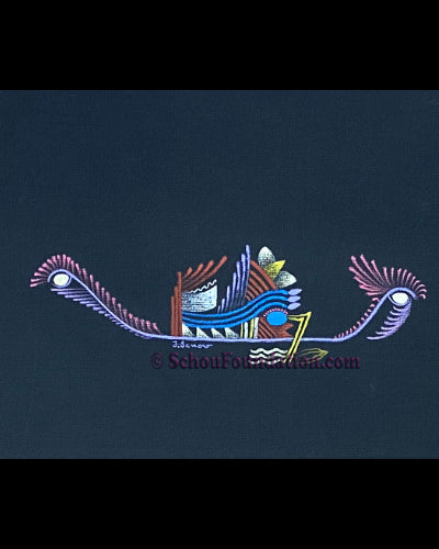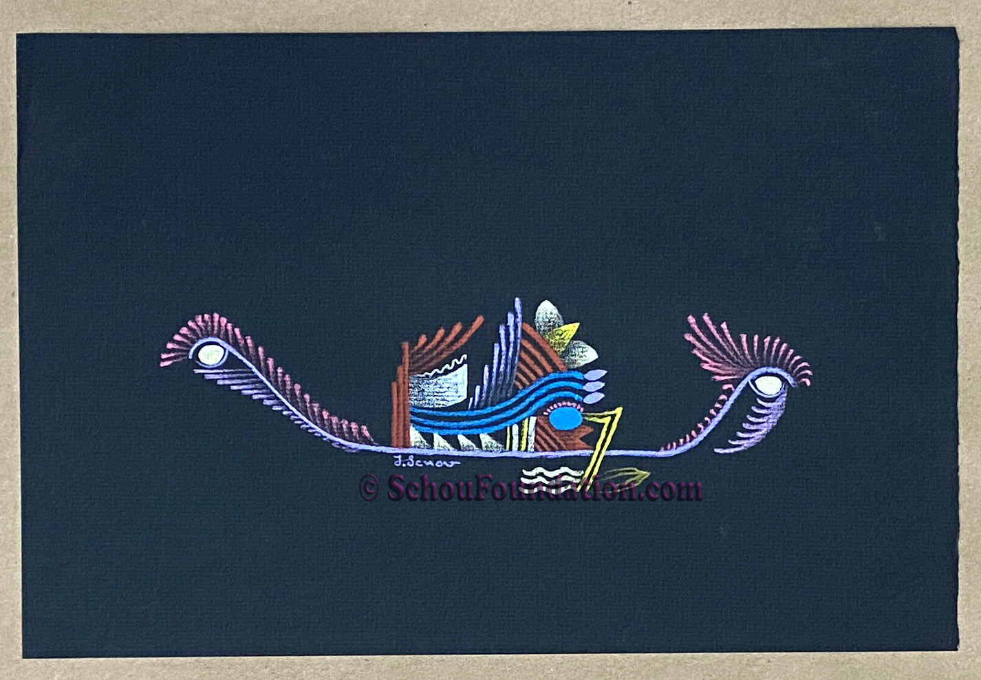 Complex vignette was created with Prismacolor wax pencil on heavy-toothed black paper; part of the Black Paper Series by San Francisco artist John Schou. Piece is signed and undated, circa 1967-1971.