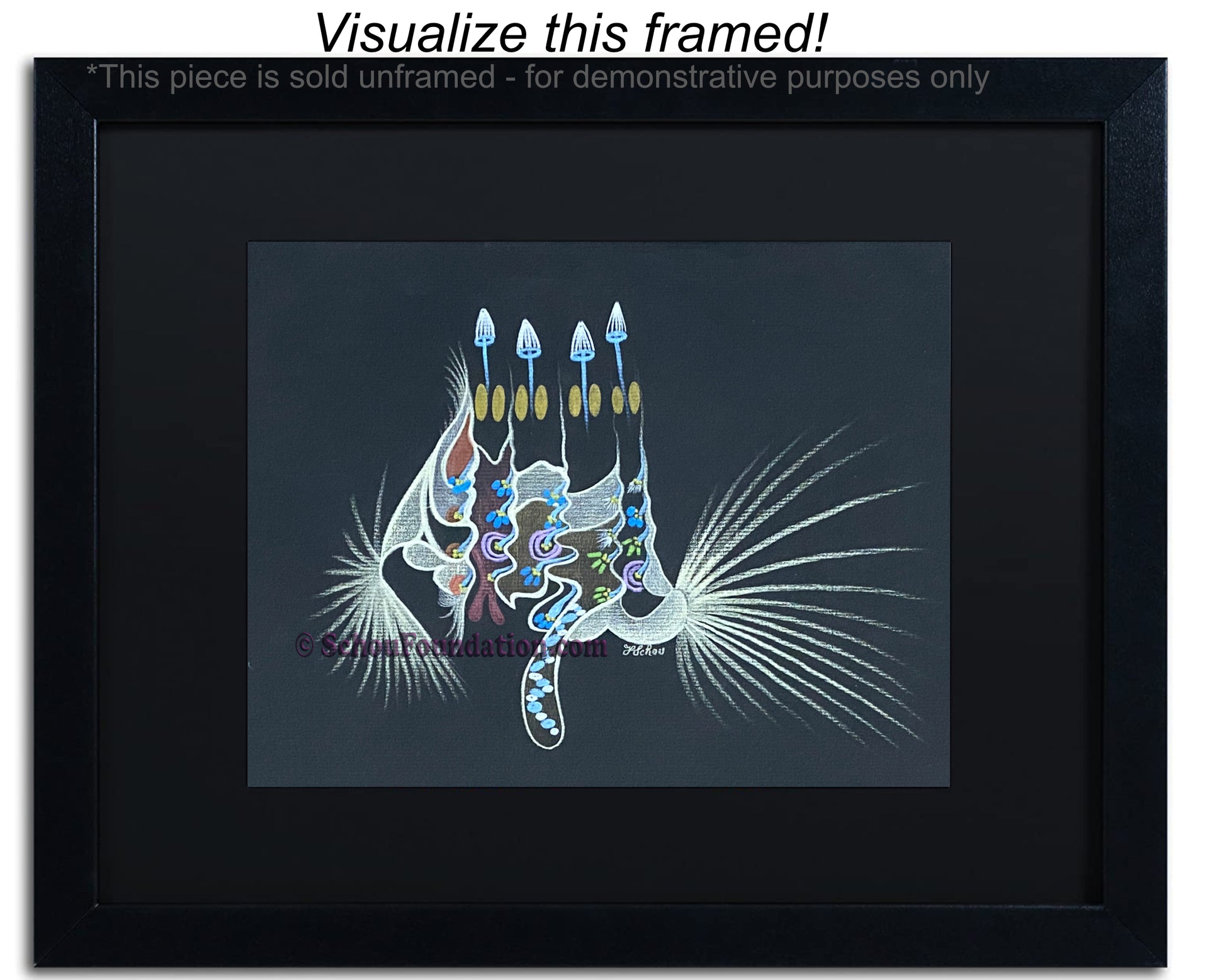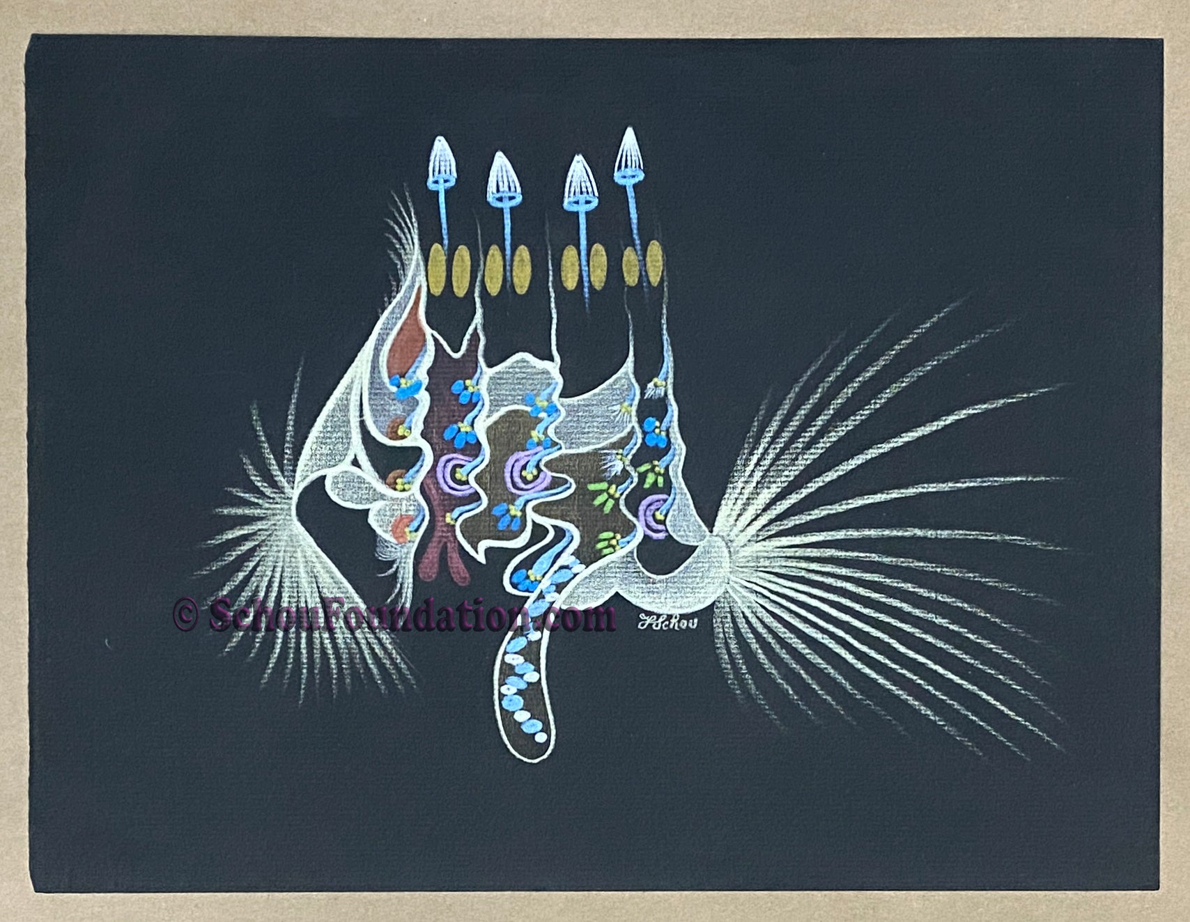 Moderately complex vignette was created with Prismacolor wax pencil on heavy-toothed black paper; part of the Black Paper Series by San Francisco artist John Schou. Piece is signed and undated, circa 1967-1971.