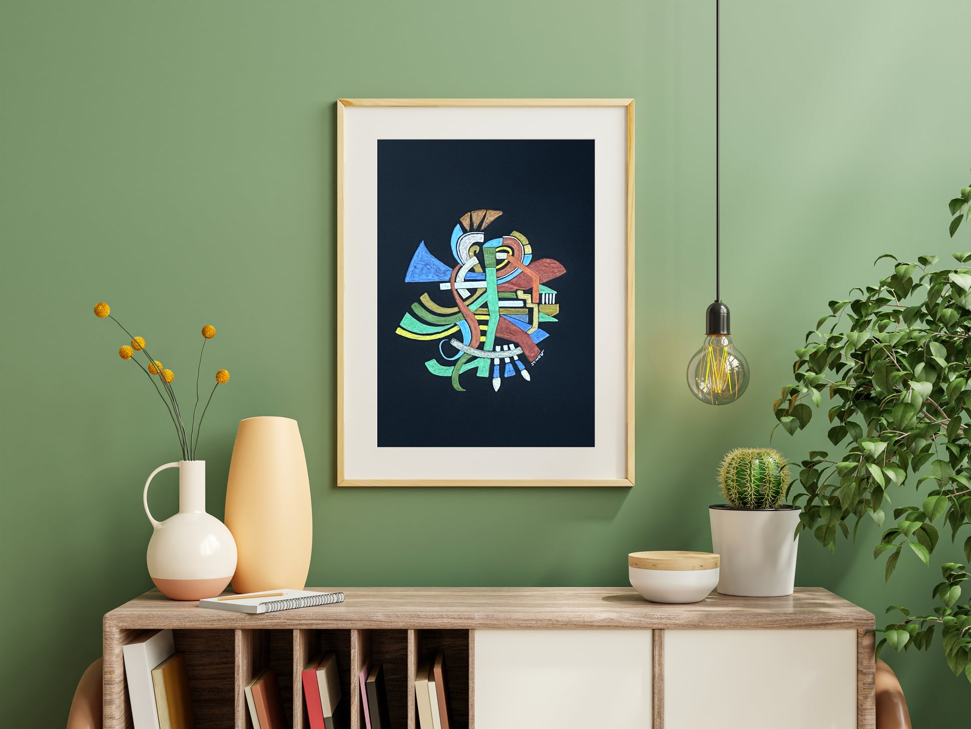Moderately complex vignette was created with Prismacolor wax pencil on heavy-toothed black paper; part of the Black Paper Series by San Francisco artist John Schou. Piece is signed and dated 1967.