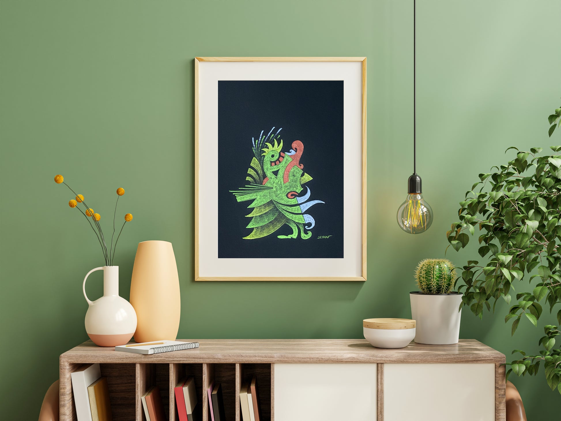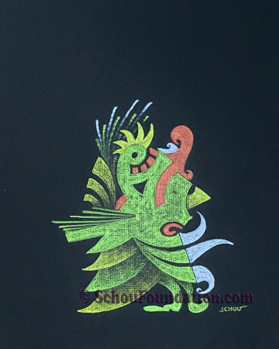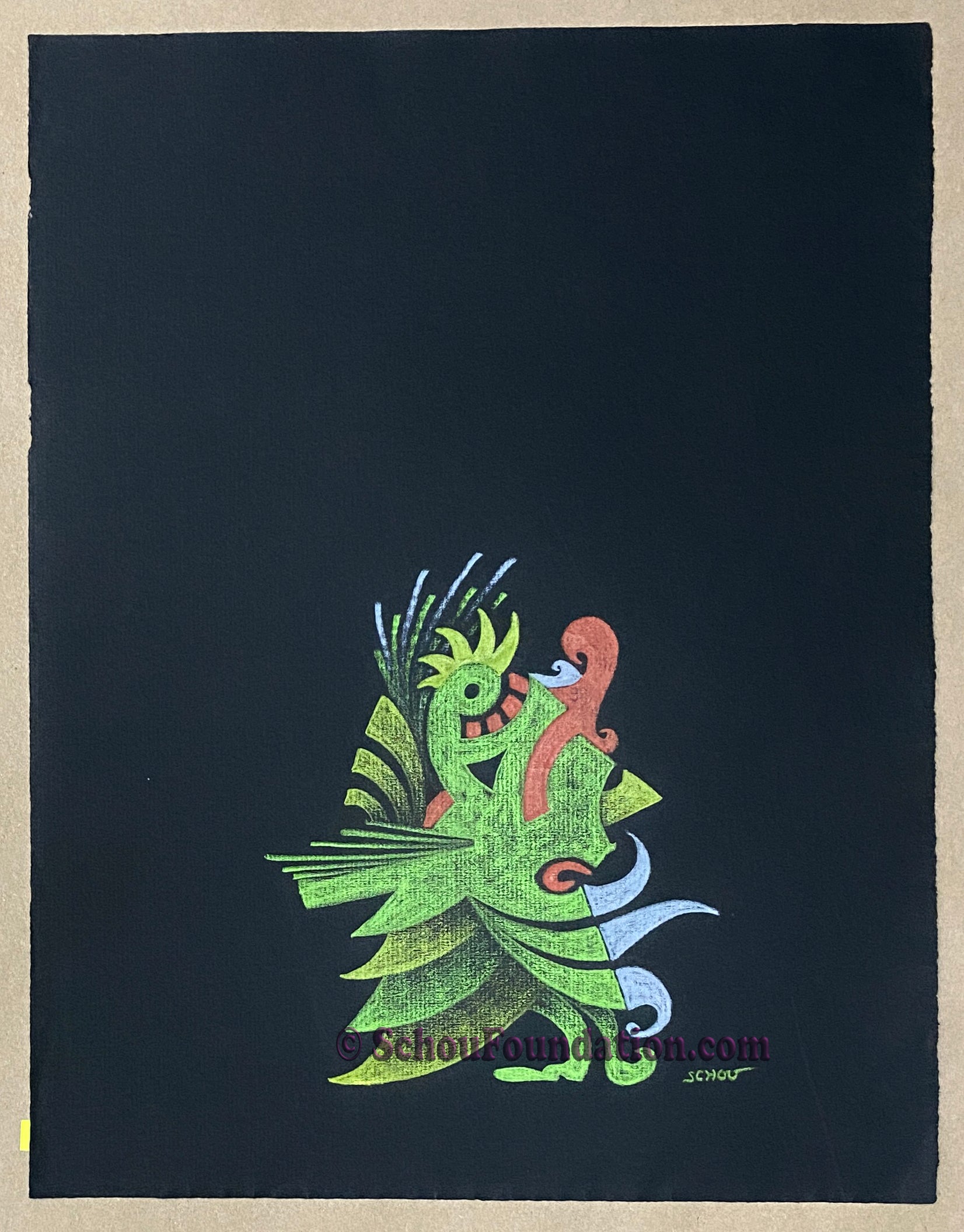 Moderately complex vignette was created with Prismacolor wax pencil on heavy-toothed black paper; part of the Black Paper Series by San Francisco artist John Schou. Piece is signed and undated, circa 1967-1971.