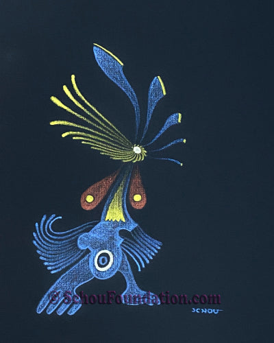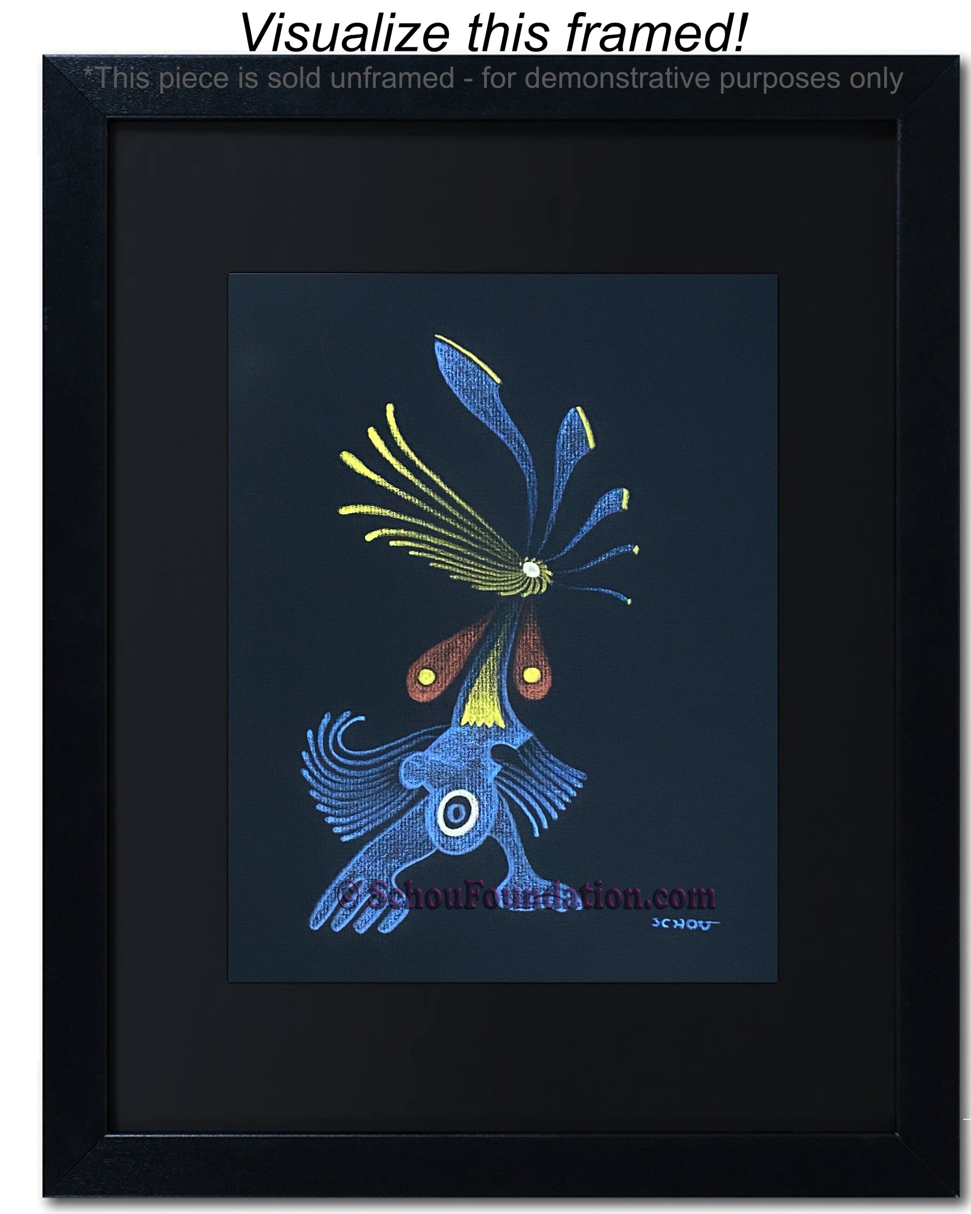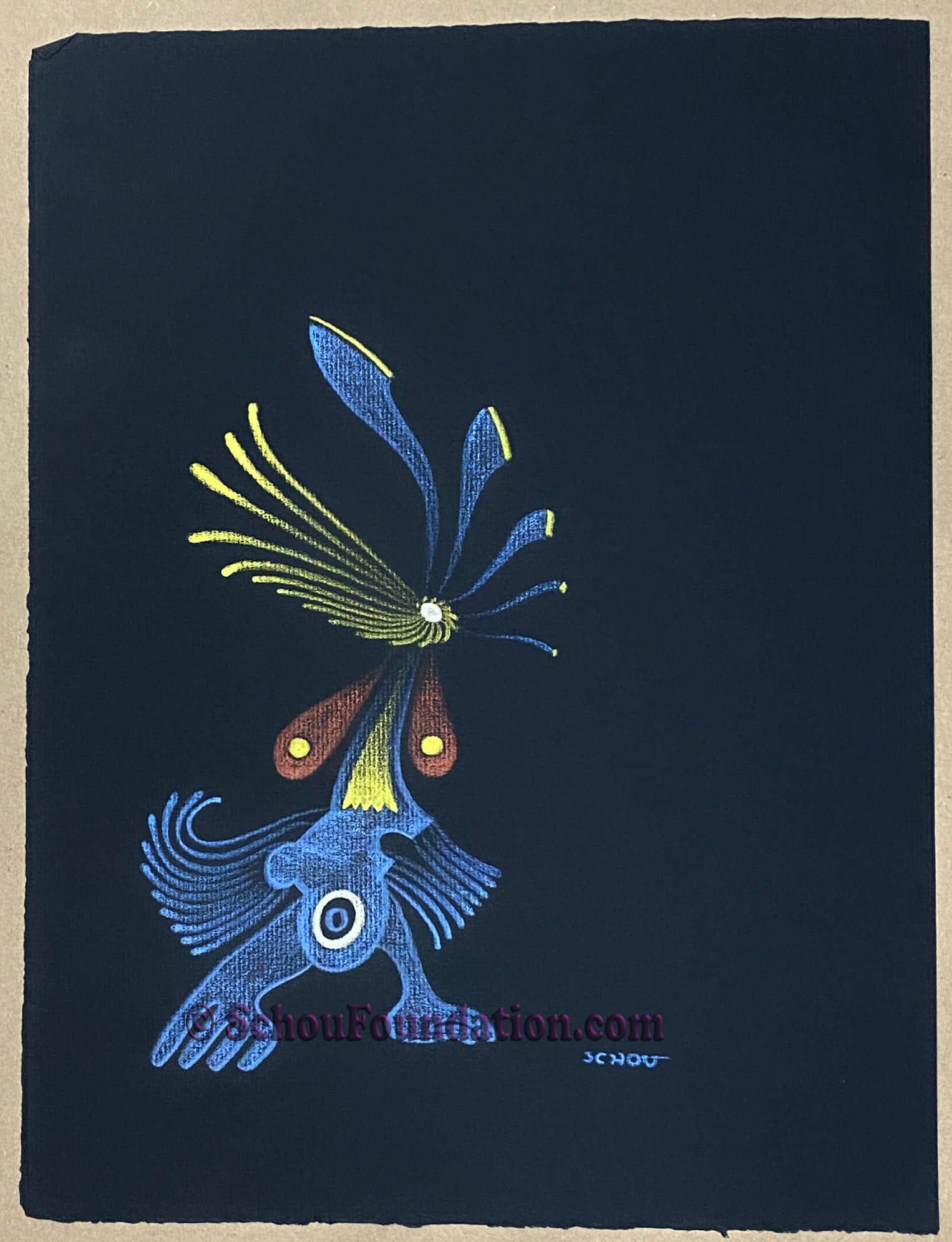 Complex vignette was created with Prismacolor wax pencil on heavy-toothed black paper; part of the Black Paper Series by San Francisco artist John Schou. Piece is signed and dated 1967.