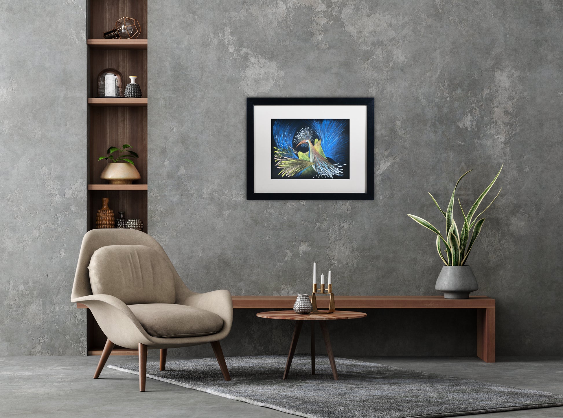 Moderately complex portrait designed with Prismacolor wax pencil on black paper; part of the Black Paper Series by San Francisco artist John Schou. Piece is signed and undated 1966-1967.