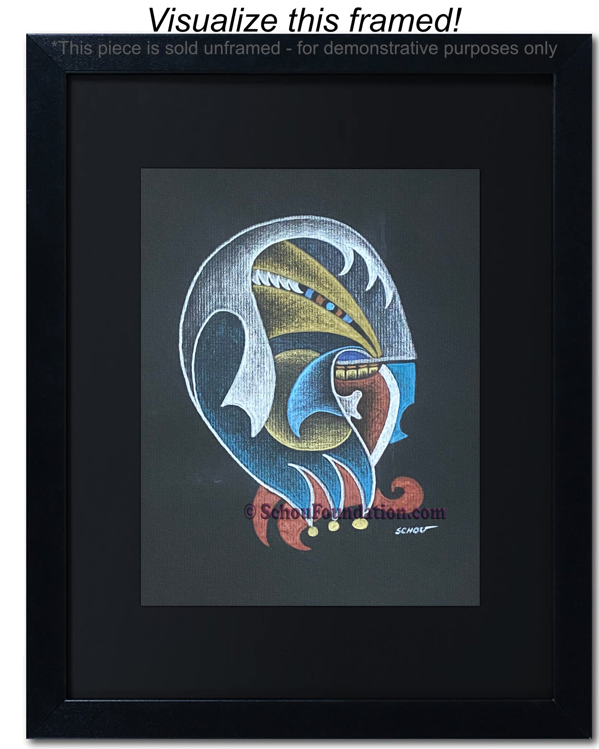 Moderately complex vignette was created with Prismacolor wax pencil on heavy-toothed black paper; part of the Black Paper Series by San Francisco artist John Schou. Piece is signed and dated May 20, 1967.