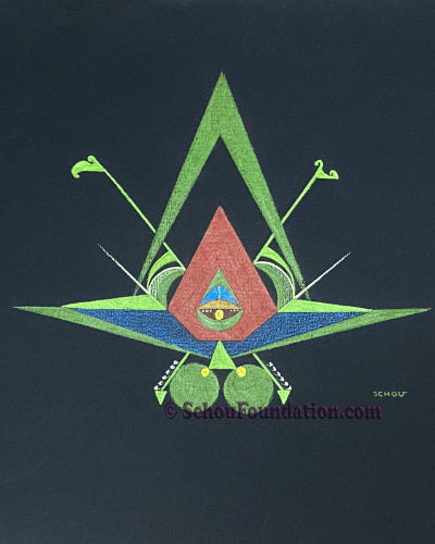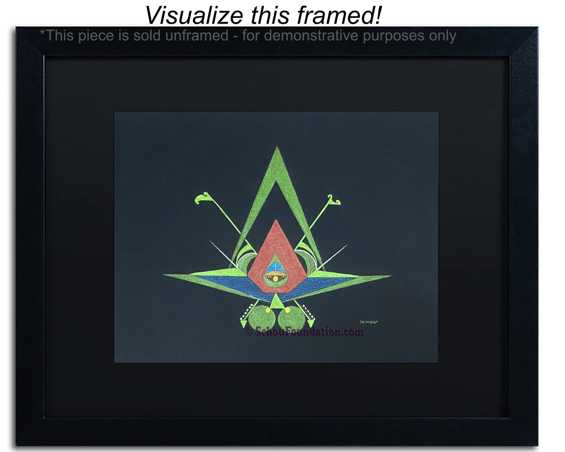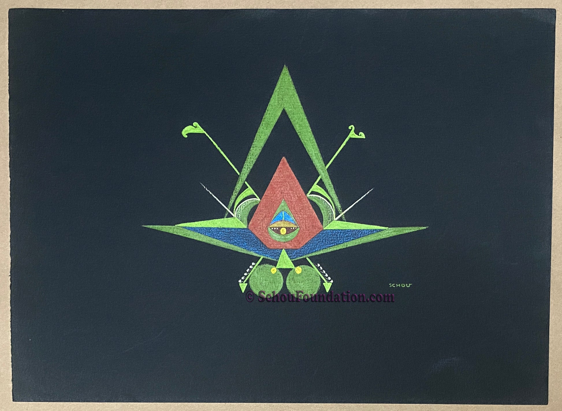 Complex vignette was created with Prismacolor wax pencil on heavy-toothed black paper; part of the Black Paper Series by San Francisco artist John Schou. Piece is signed and undated, circa 1967-1971.