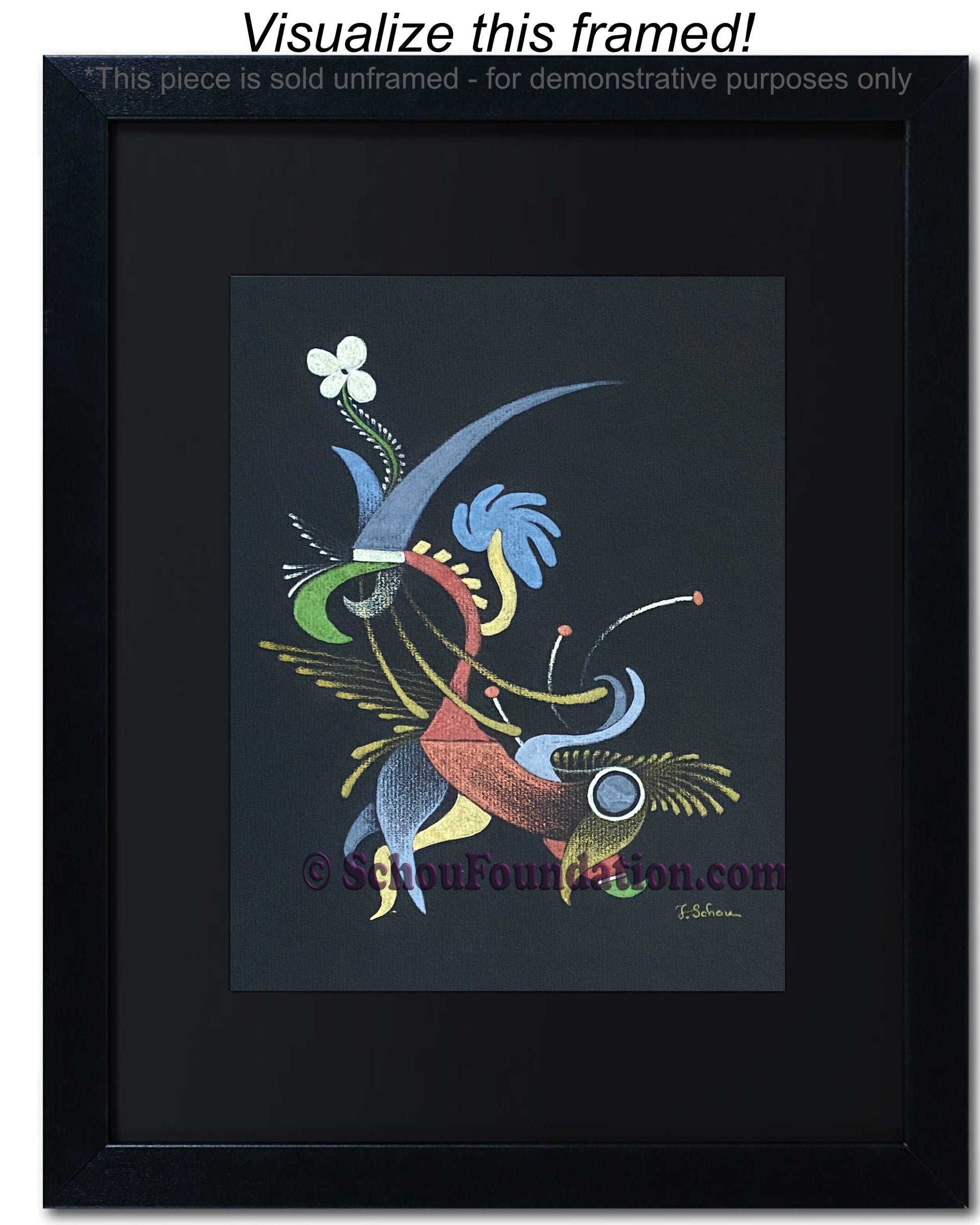 Moderately complex vignette was created with Prismacolor wax pencil on heavy-toothed black paper; part of the Black Paper Series by San Francisco artist John Schou. Piece is signed and dated April 1967.