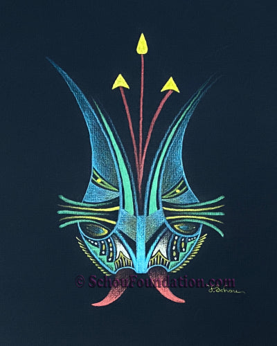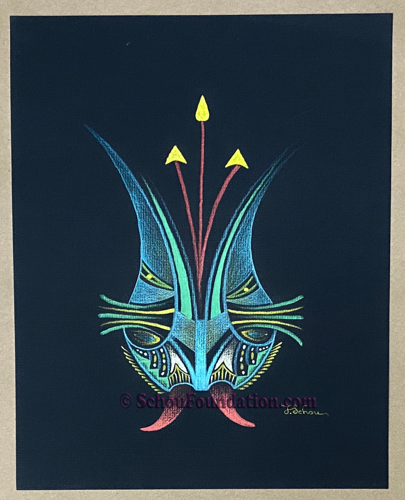 Complex vignette was created with Prismacolor wax pencil on heavy-toothed black paper; part of the Black Paper Series by San Francisco artist John Schou. Piece is signed and undated, circa 1967-1971.