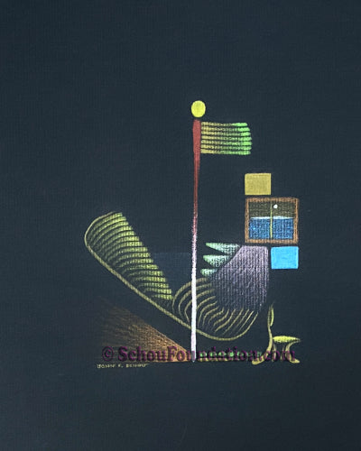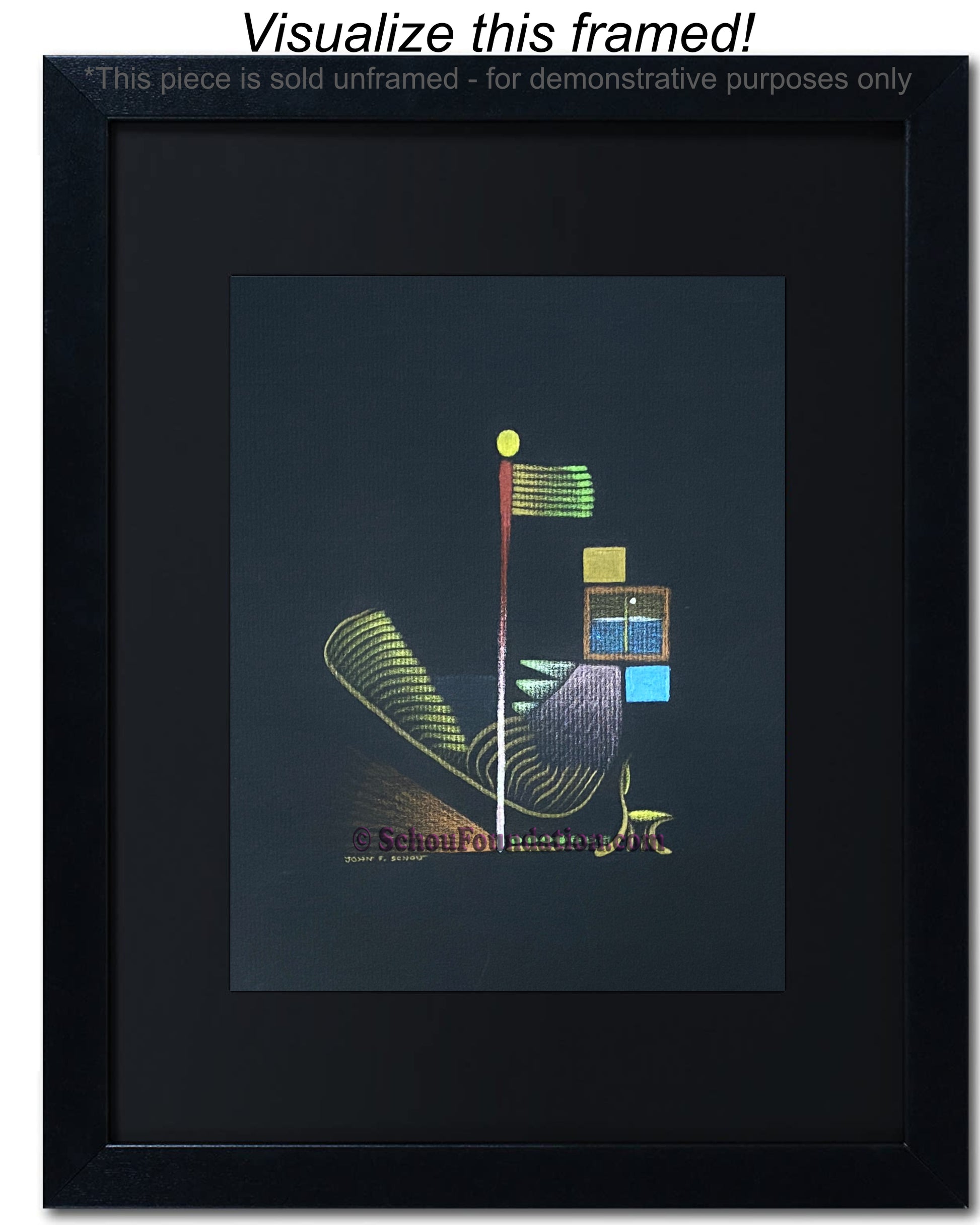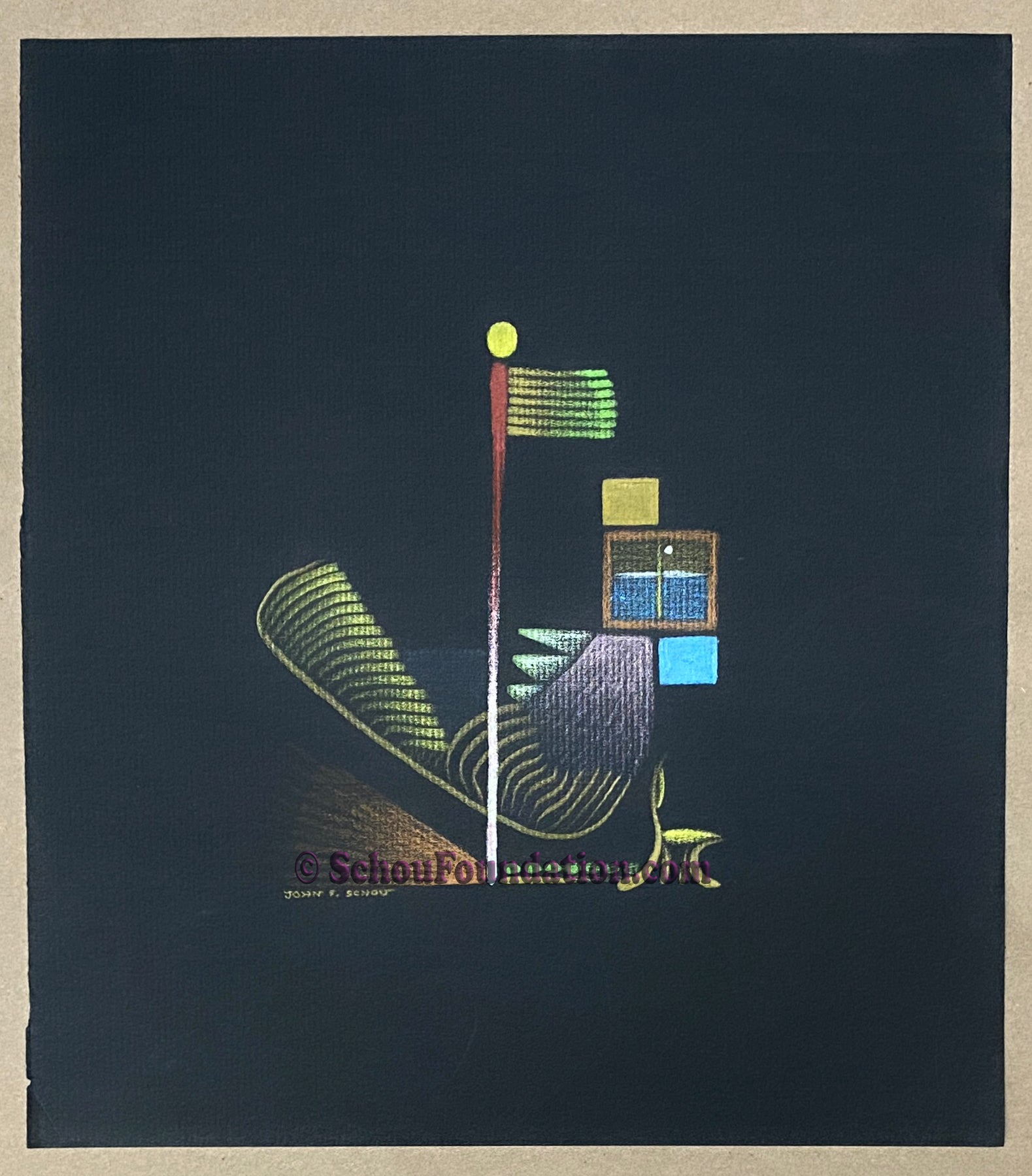 Complex vignette was created with Prismacolor wax pencil on heavy-toothed black paper; part of the Black Paper Series by San Francisco artist John Schou. Piece is signed and undated, circa 1967-1971.