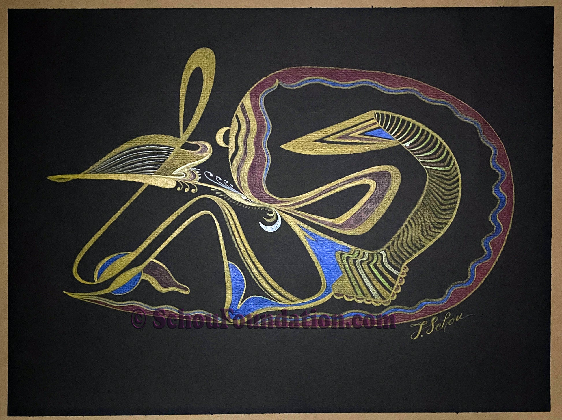 This extremely complex piece is designed with Prismacolor wax pencil on heavy-toothed black paper; part of the Black Paper Series by San Francisco artist John Schou. Piece is signed and undated, circa 1967-1971.