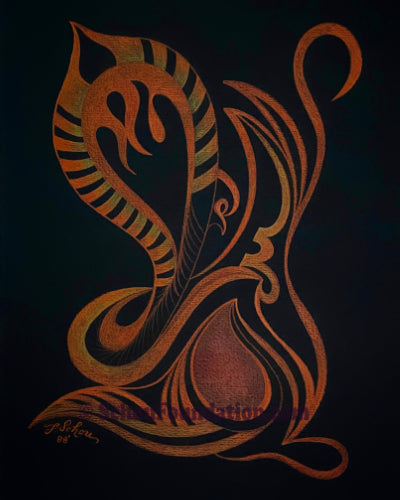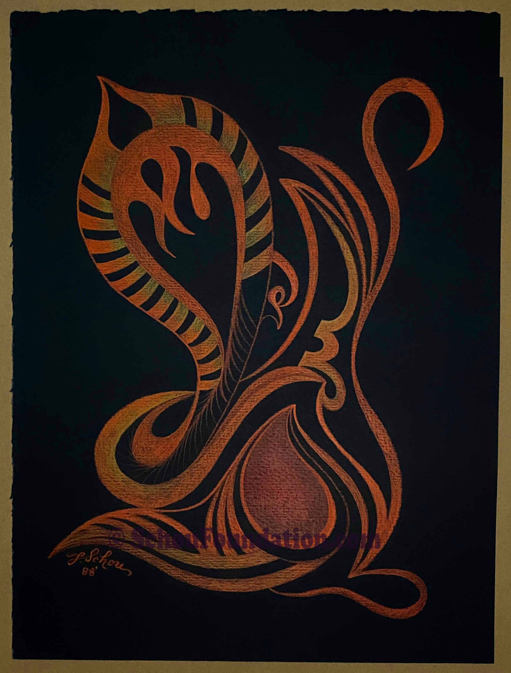 This complex piece is designed with Prismacolor wax pencil on heavy-toothed black paper; part of the Black Paper Series by San Francisco artist John Schou. Piece is signed and dated 1988.