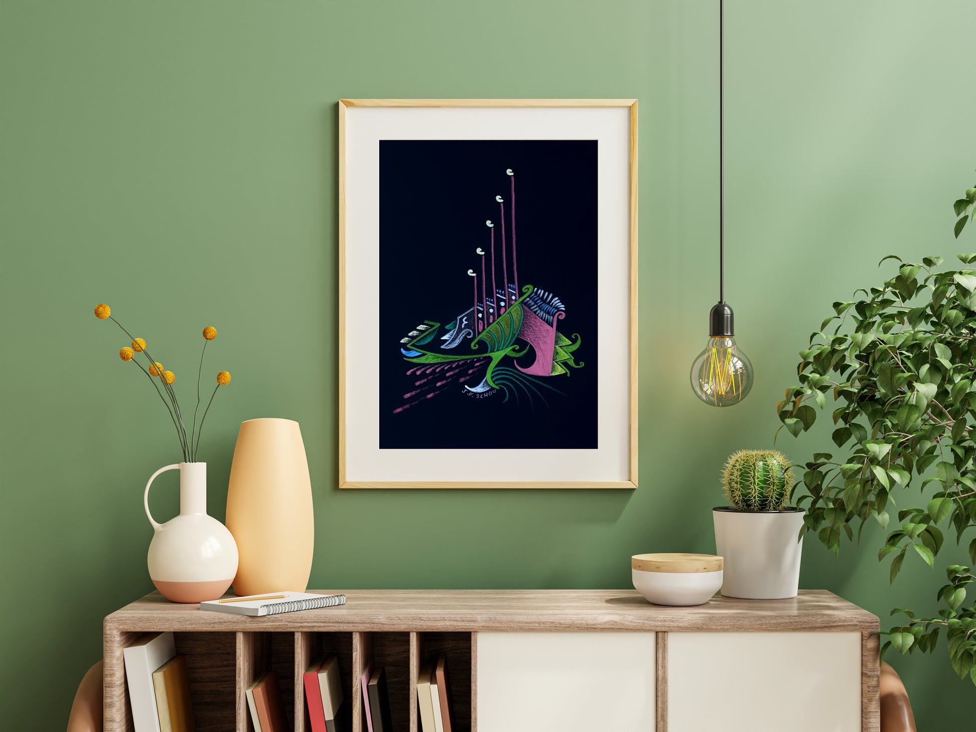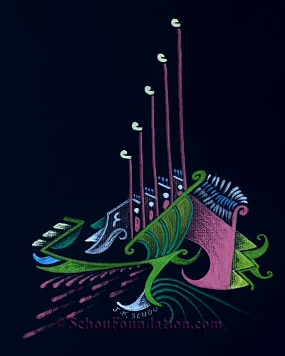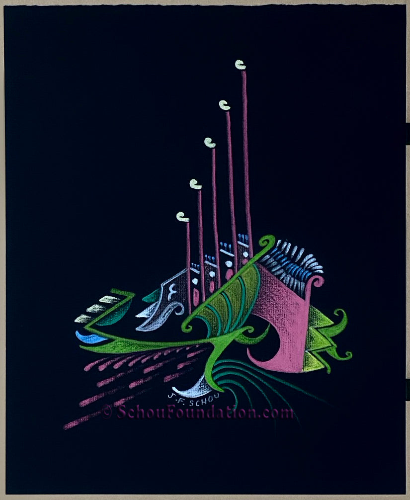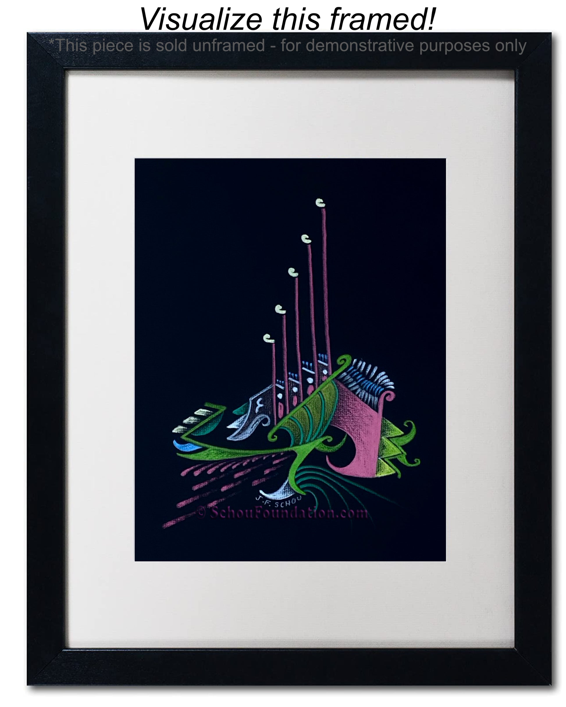 This complex, elegant piece features Prismacolor wax pencil on black heavy tooth paper - part of the Black Paper Series. Created by San Francisco artist John Schou, this piece is signed and undated, circa 1966-1968.