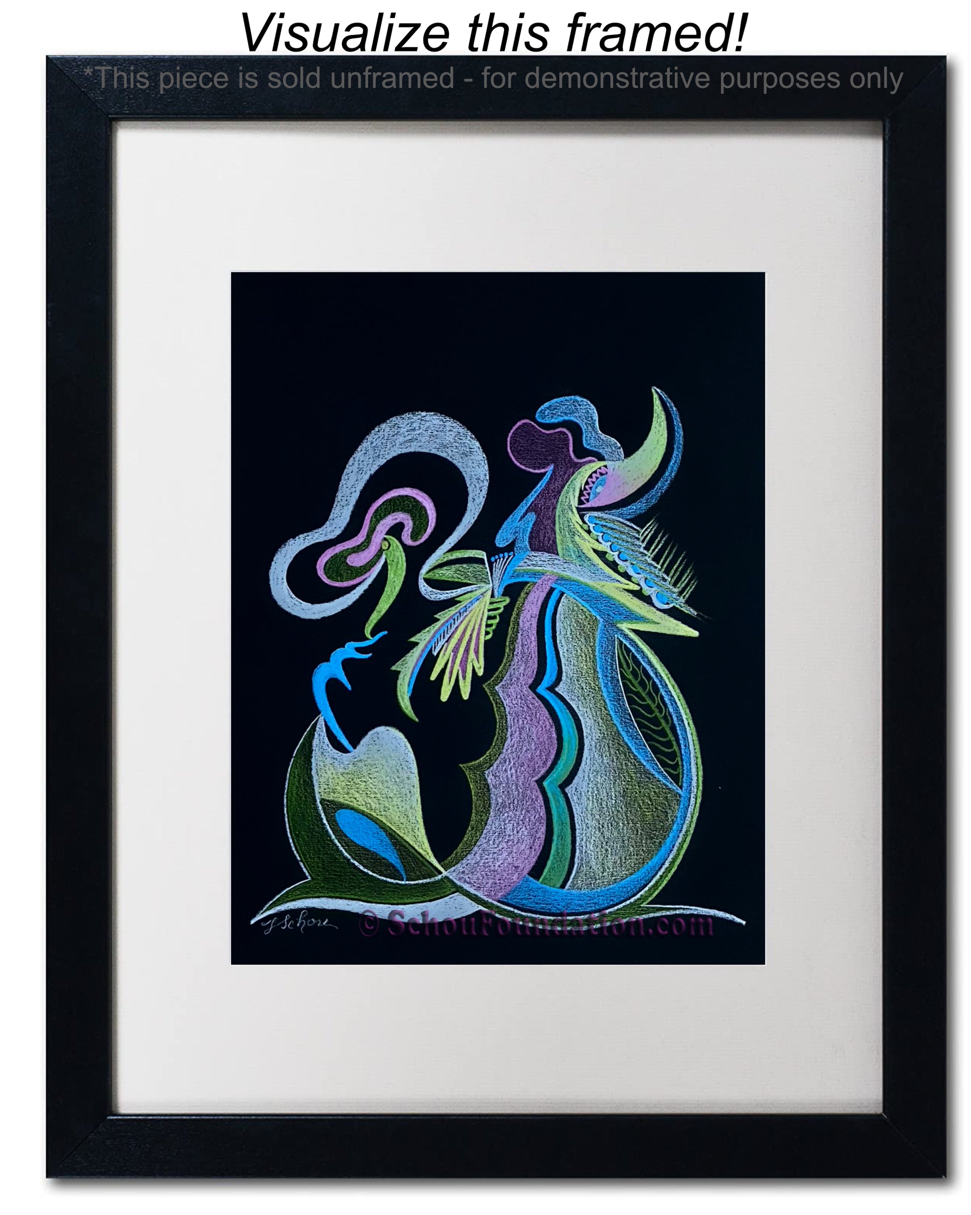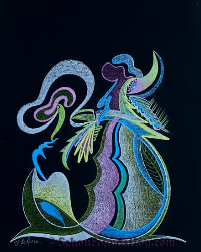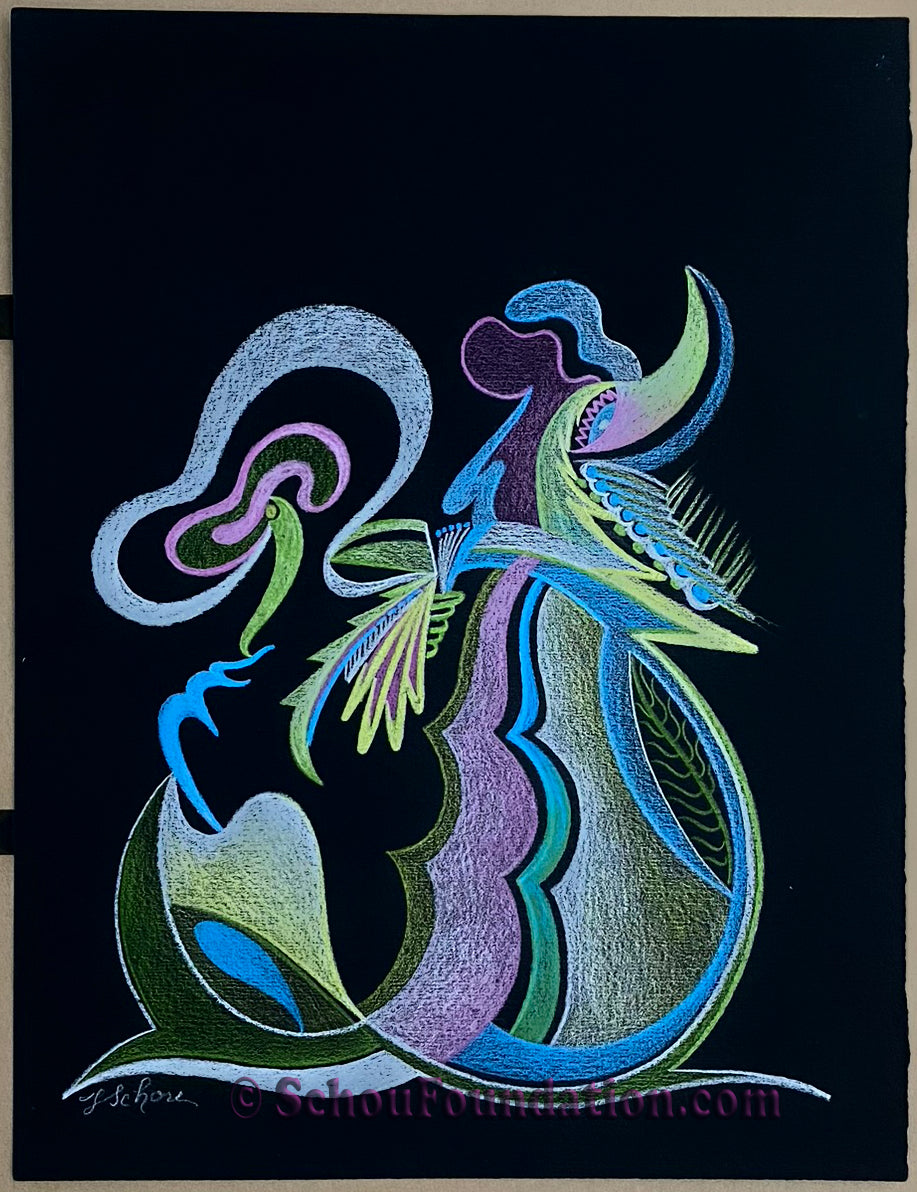 This moderately complex piece features Prismacolor wax pencil on black heavy tooth paper - part of the Black Paper Series. Created by San Francisco artist John Schou, this piece is signed and undated, circa 1966-1968.