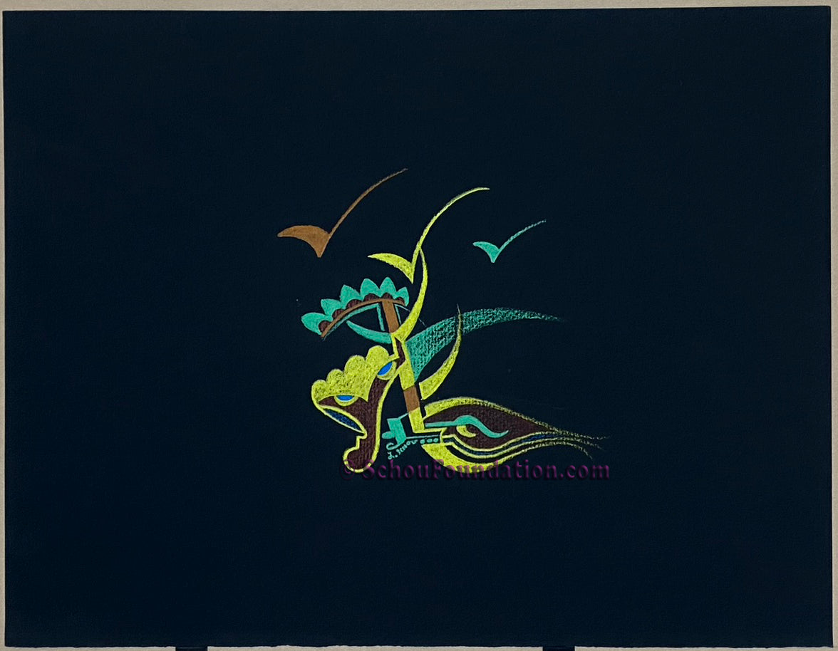 This moderately complex vignette features Prismacolor wax pencil on black heavy tooth paper - part of the Black Paper Series. Created by San Francisco artist John Schou, this piece is signed and undated, circa 1966-1968.