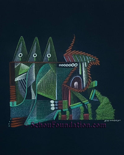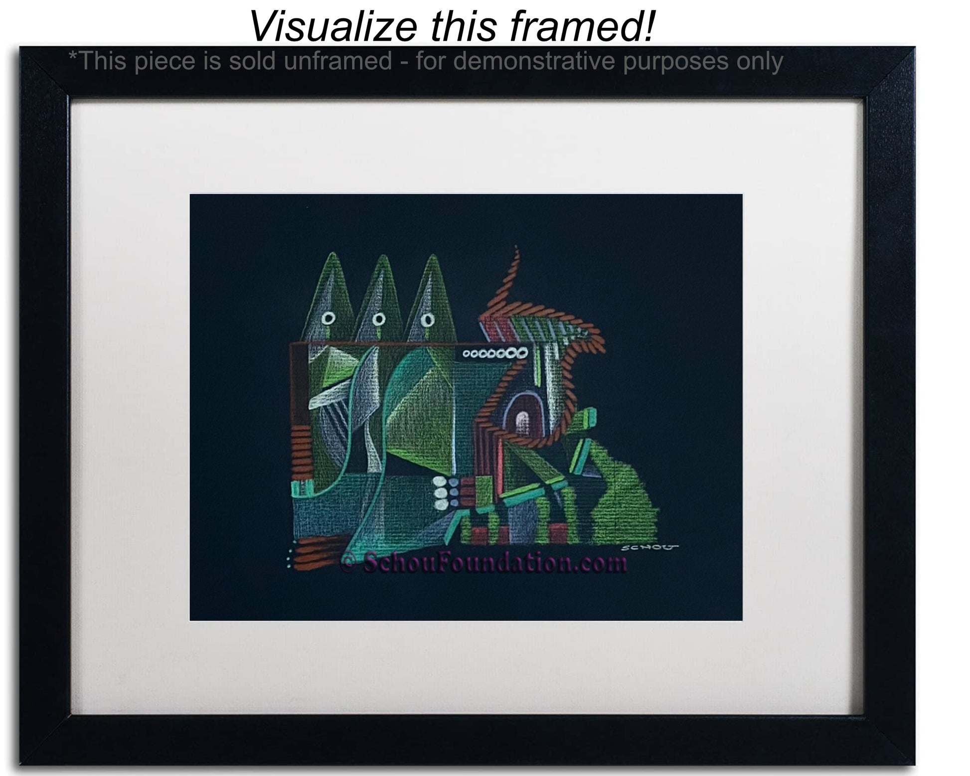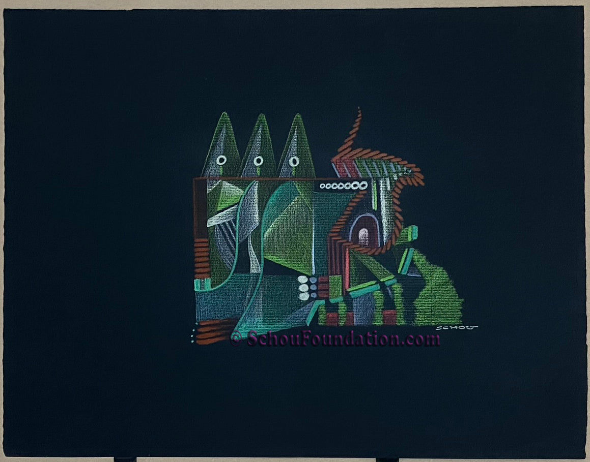 This moderately complex, elegant vignette features Prismacolor wax pencil on black heavy tooth paper - part of the Black Paper Series. Created by San Francisco artist John Schou, this piece is signed and dated 1/1967.
