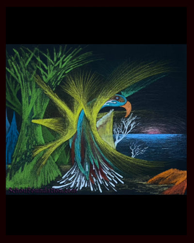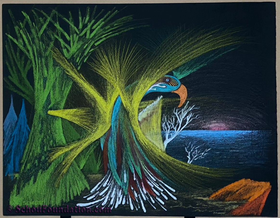 This moderately complex abstract features Prismacolor wax pencil on black heavy tooth paper - part of the Black Paper Series. Created by San Francisco artist John Schou, this piece is signed and undated, circa 1966-1968.