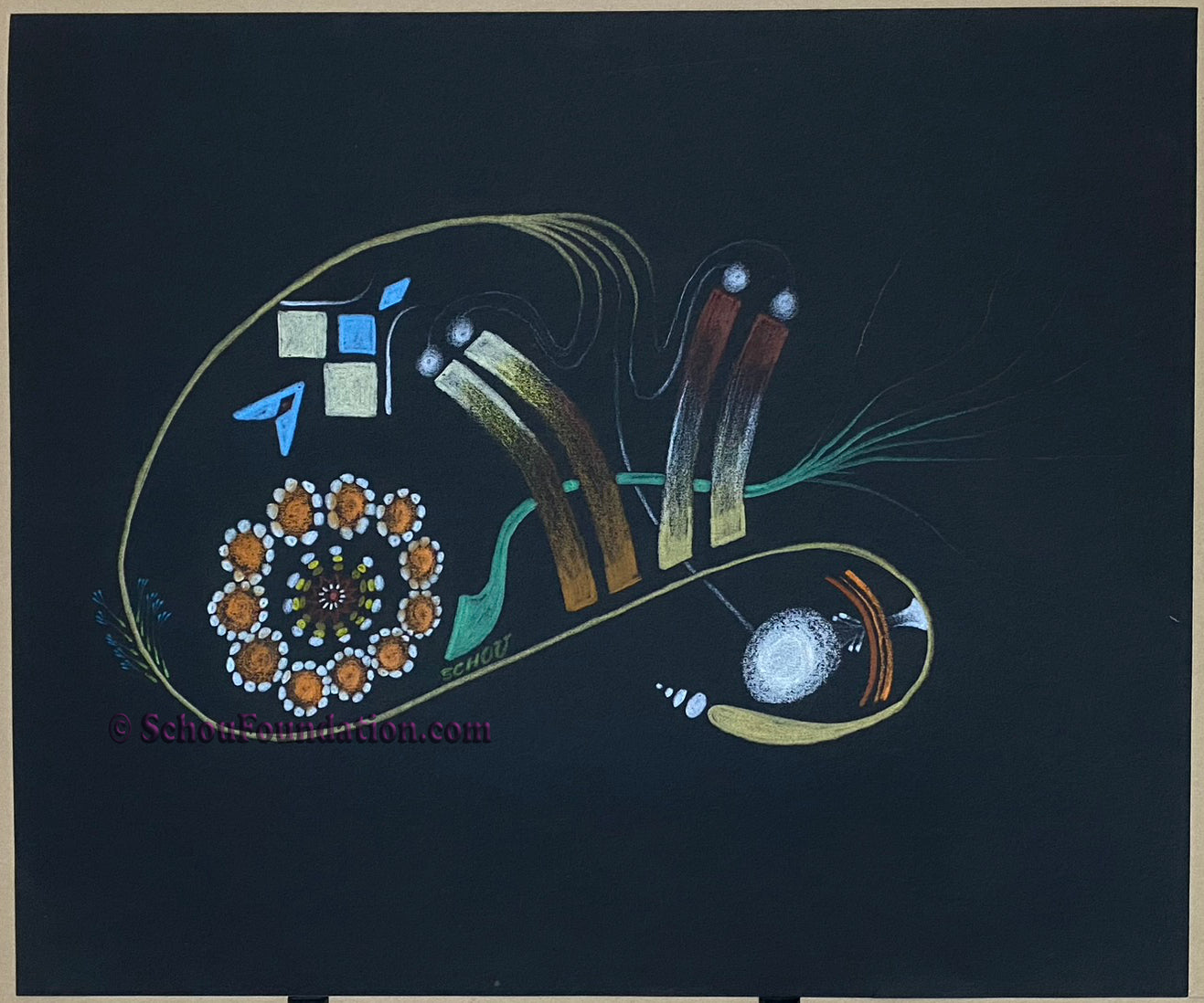 This elegant, simple piece features Prismacolor wax pencil on black heavy tooth paper - part of the Black Paper Series. Created by San Francisco artist John Schou, this piece is signed and undated, circa 1966-1968.