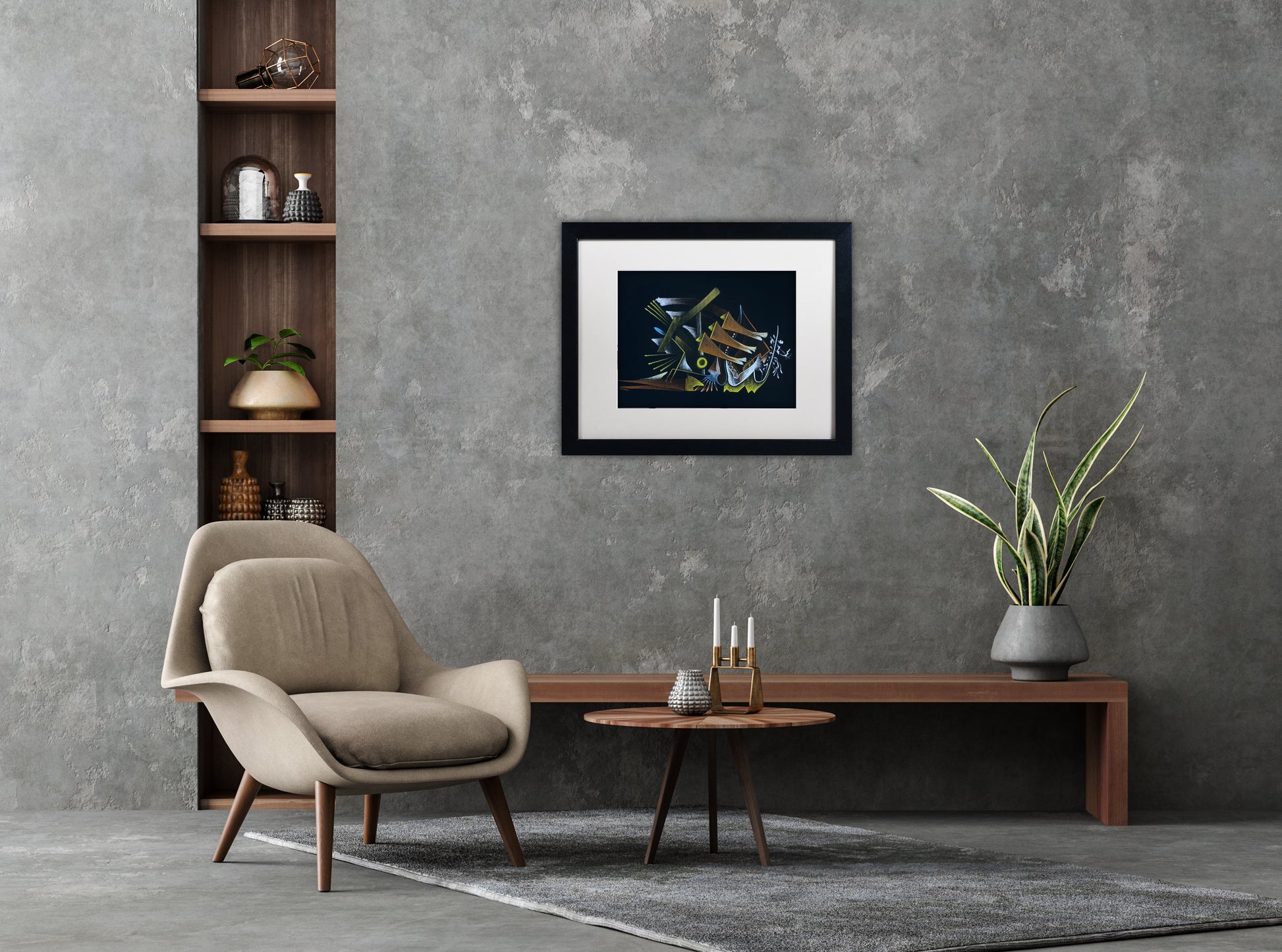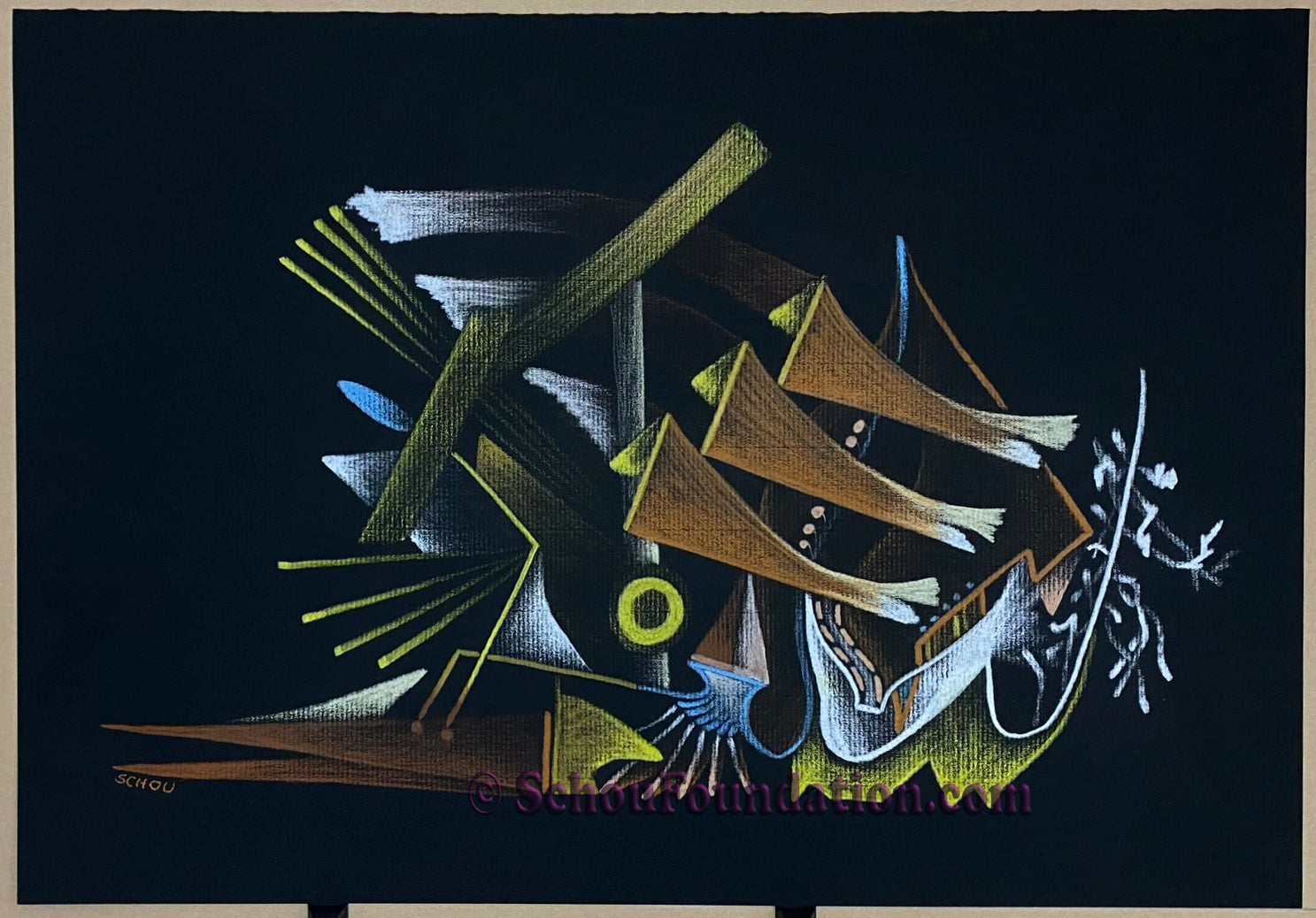 This moderately complex vignette features Prismacolor wax pencil on black heavy tooth paper - part of the Black Paper Series. Created by San Francisco artist John Schou, this artwork is signed and undated, circa 1966-1969.